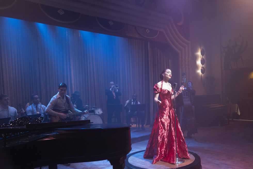 Nieddu's other designs comprised the rest of the film's wardrobe, which incorporated an eclectic mix of vintage accessories, pristine stage gowns and '40s-'50s silhouettes. Nods to the signature white gardenia Holiday adorned her hair with are prevalent, as well.