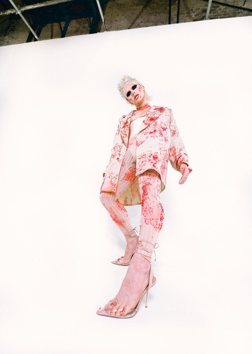 Bimini's interpretation came in the form of a flesh-toned "zit suit," covered entirely with clusters of red 3D gems that resembled acne breakouts. Even her makeup and shoes matched, with enough pustules to make a pimple popper lose their mind.