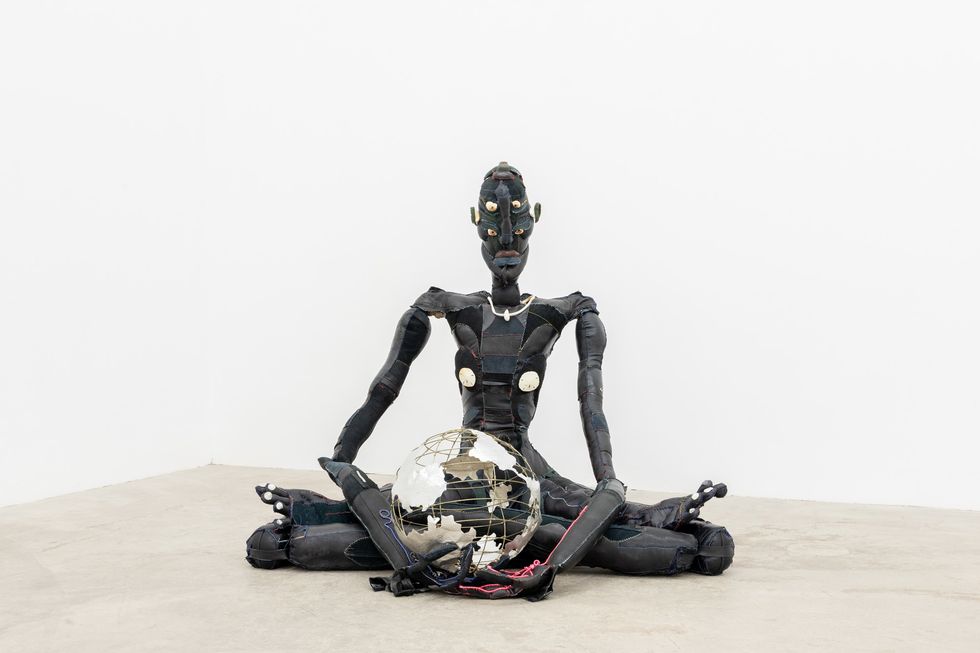 Tau Lewis is a self-taught artist who incorporates found and donated objects as well as recycled material into her work. Born in 1993 to a Jamaican-Canadian family in Toronto, her work incorporates the legacy of the Black diaspora. "Harmony," along with her other works shown by the Cooper Cole Gallery at Art Basel, is part of a body of work devoted to celestial ancestors. The artist has an interest in sci-fi and it lends itself to her unique take on sculpture.