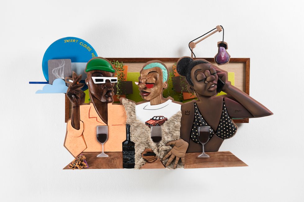 Marcus Brutus lives and works in Queens and grew up outside of Washington, DC, in Maryland. The 28-year-old is a self-taught artist who started out working in PR. Brutus' paintings depict the breadth of the Black experience. "Campus Clique" is from his series "Pearlescent Veil of Blackness," which shows "ordinary depictions of black subjects... intended to represent black humanity in its truest essence."