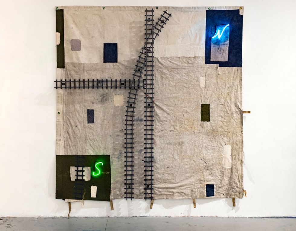 "Pushman, Pullman, Portage" (2019) Shipping tarps, railroad tracks and neon. Jack Shainman Gallery