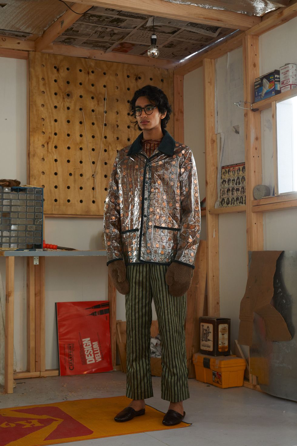 This season's collection was full of hidden knickknacks and celebrated the spirit of being a collector. One piece in particular stood out: a translucent jacket filled with pennies, orderly lined up as if placed on a grid. "My mother collected pennies and Todd collected Buffalo Nickels so I really wanted to incorporate that into this jacket," Bode told PAPER.