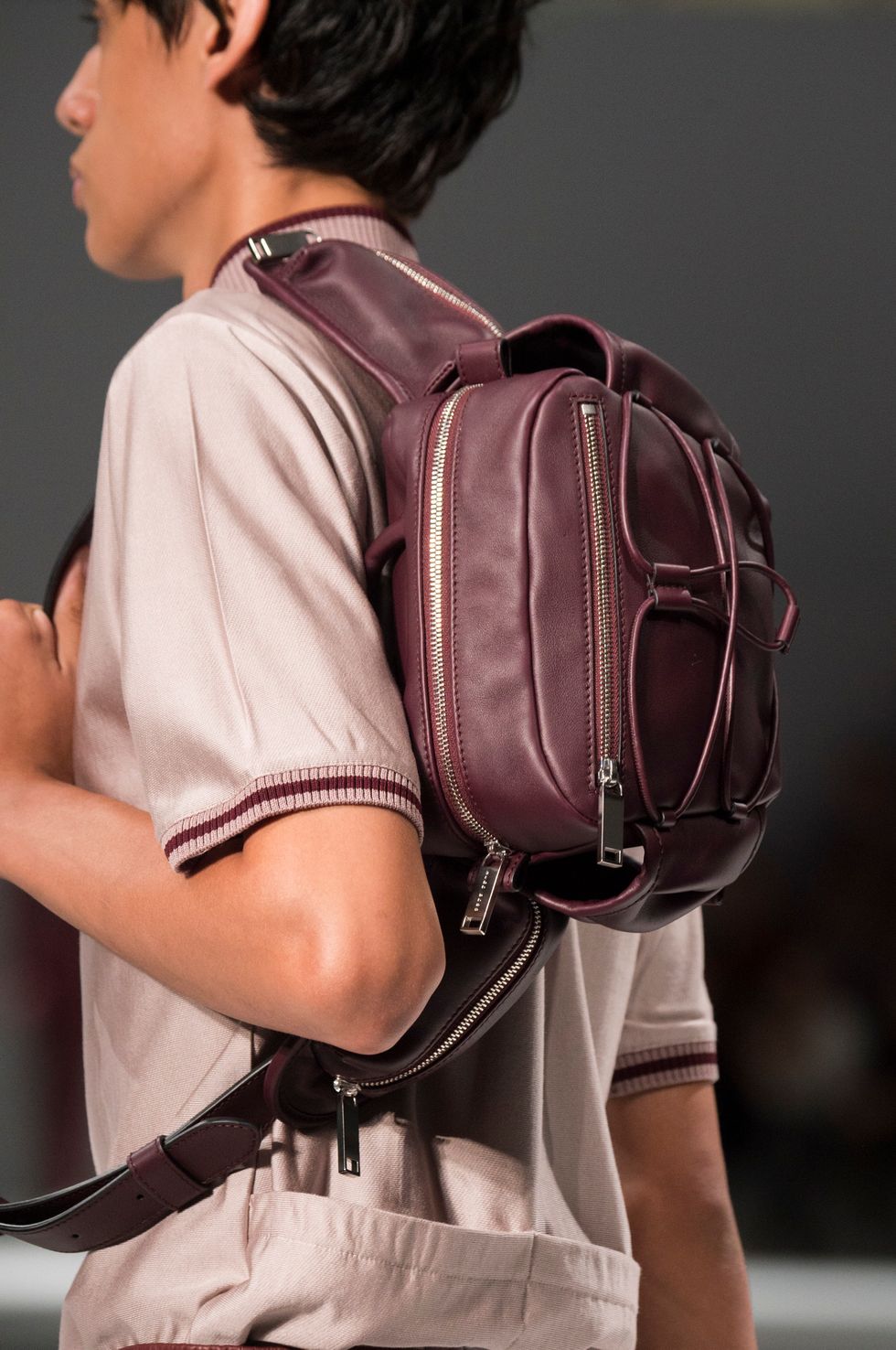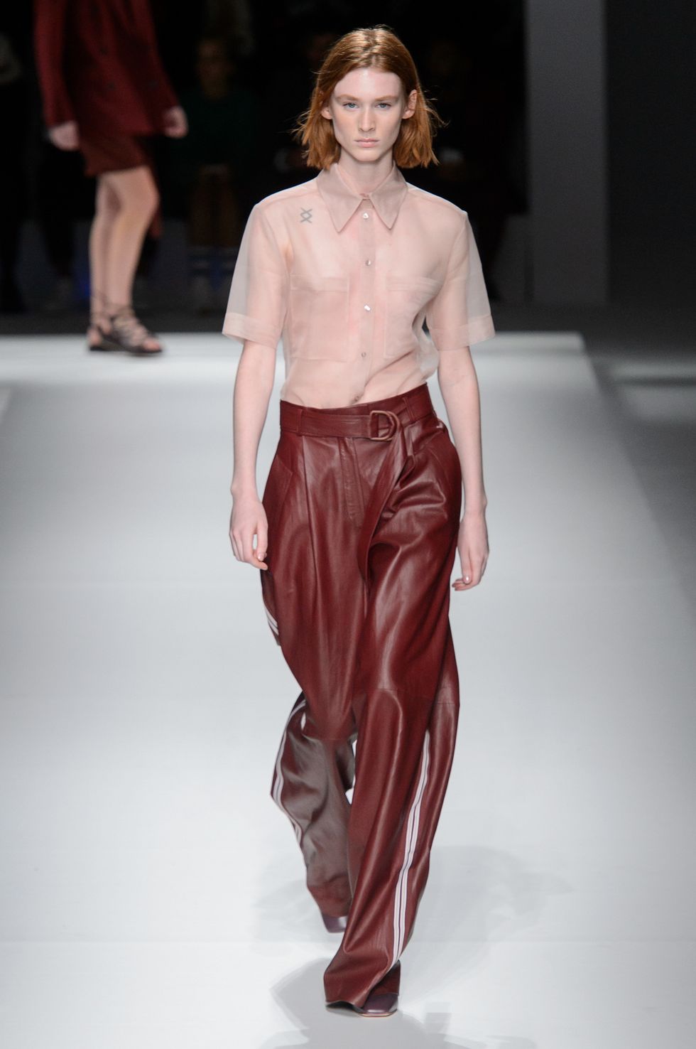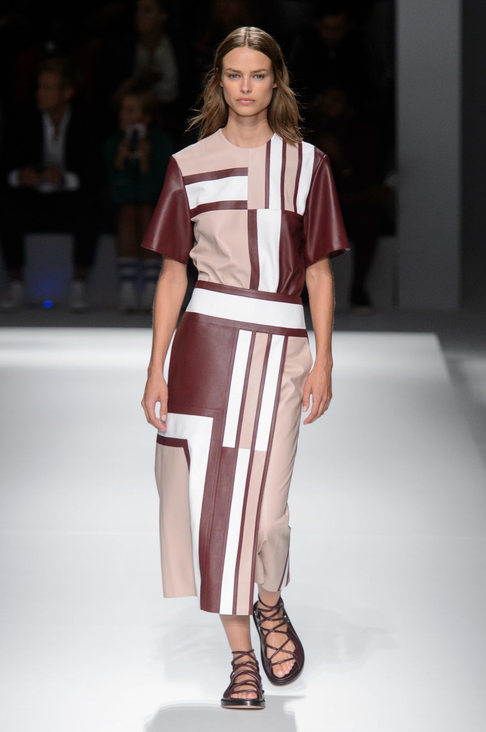 Full looks in taupe, navy, merlot, and gray dominated the collection. Elsewhere, the colors were combined in Mondrian-esque blocks and applied to skirts with high slits and t-shirt-like leather tops. Bright mustard and orange also popped up, bringing brightness to the otherwise subdued color palette.
