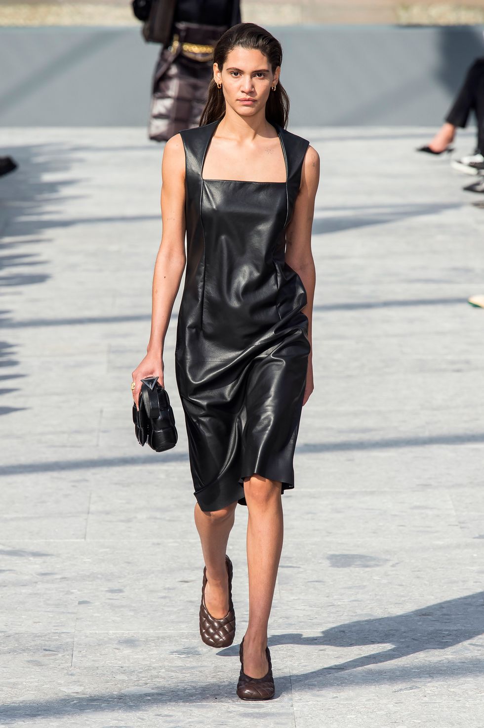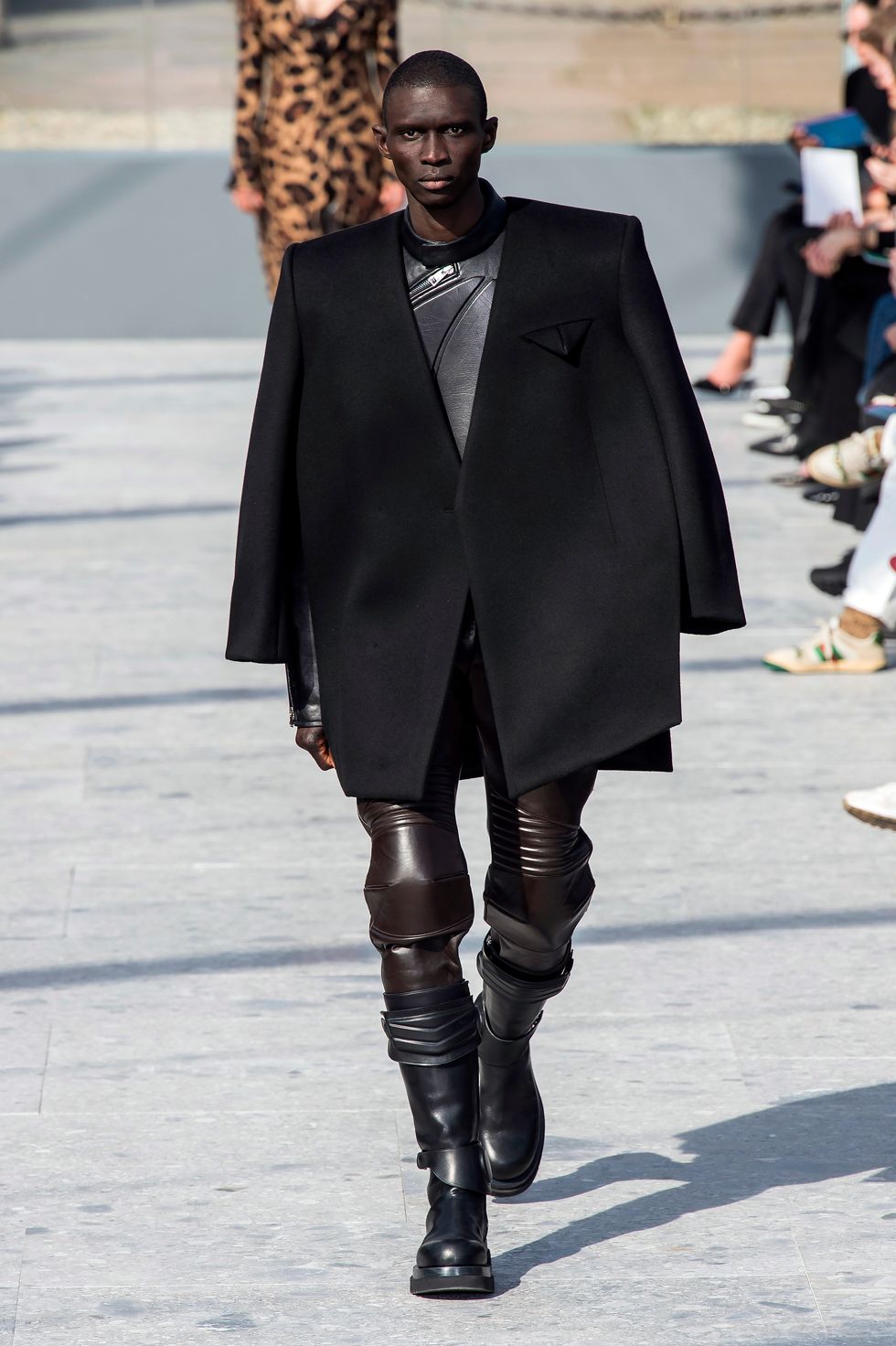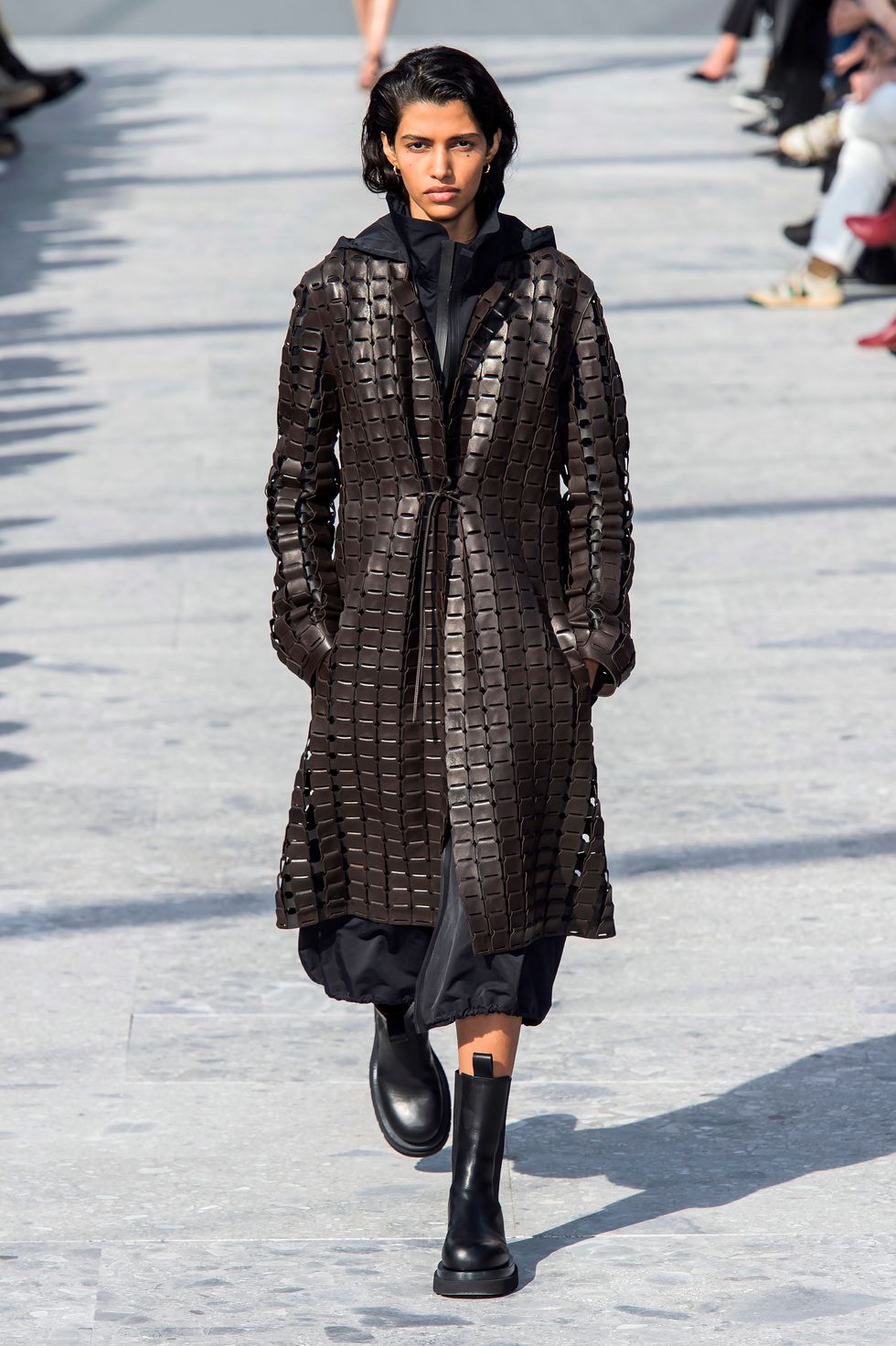 The house's heritage Intrecciato weave was reinterpreted in the form of polished dresses as well as woven pants for men and our favorites: the structured blazers and long coats for women in black or berry hued leathers.