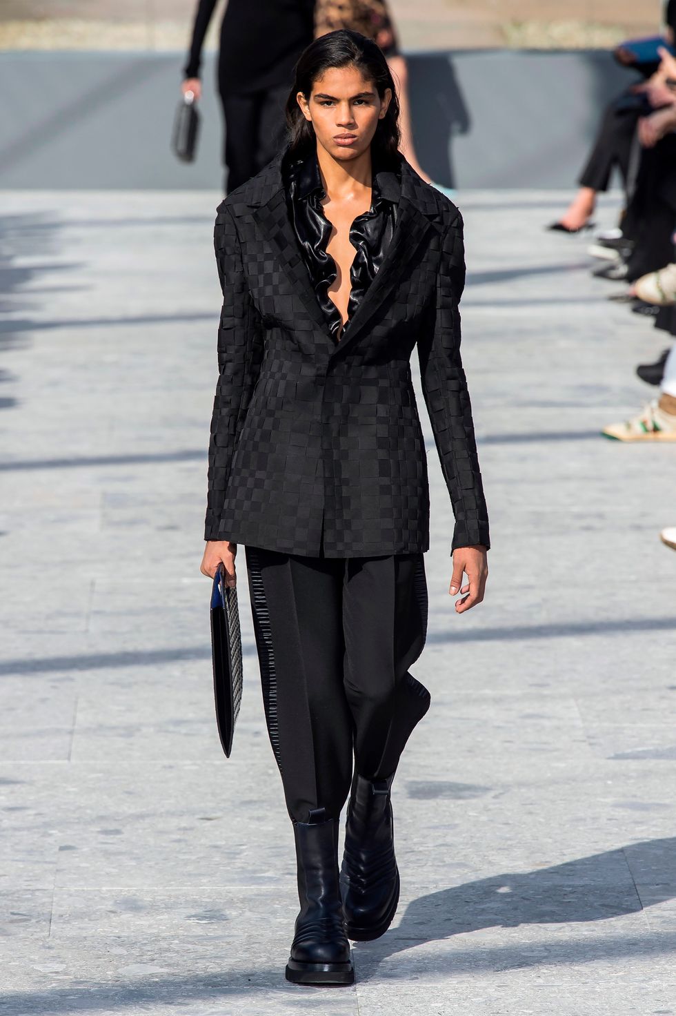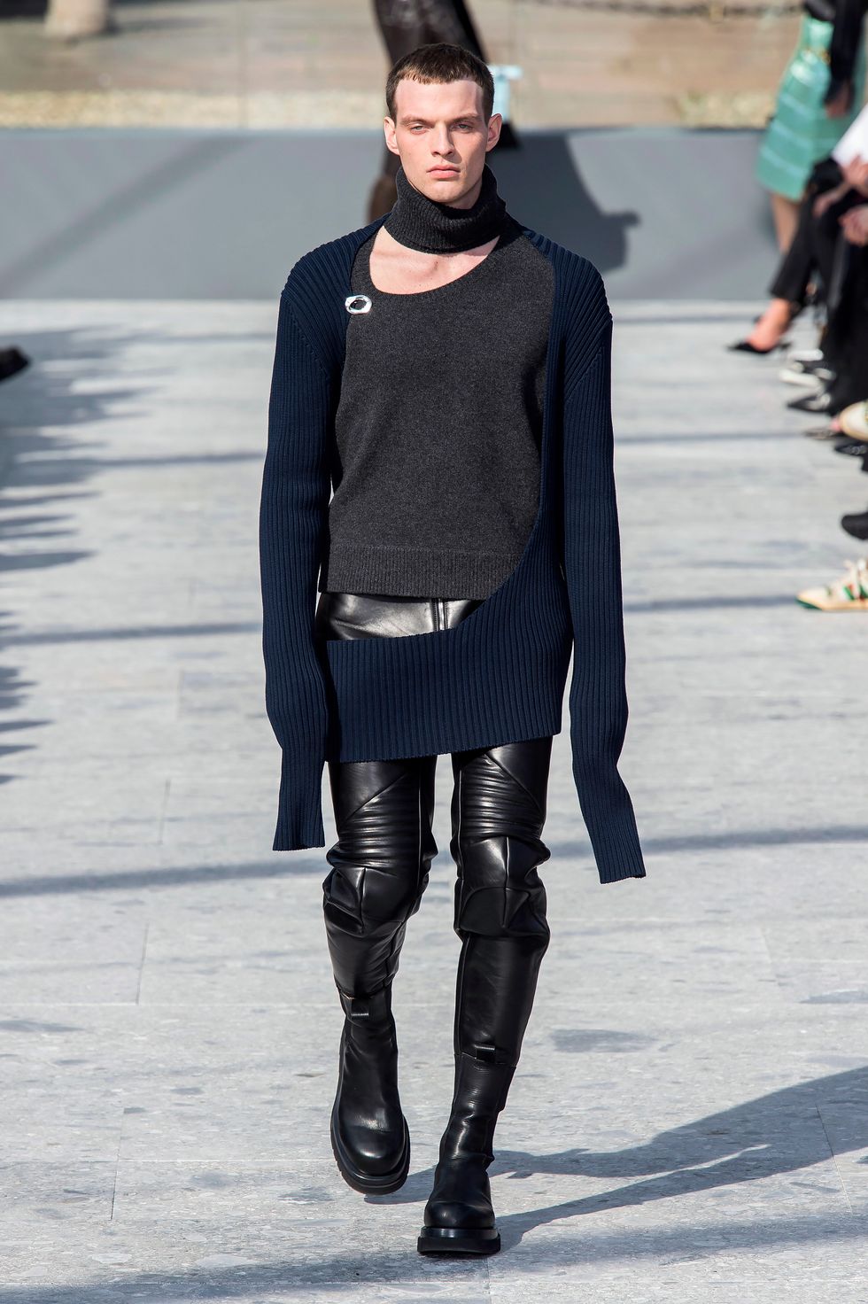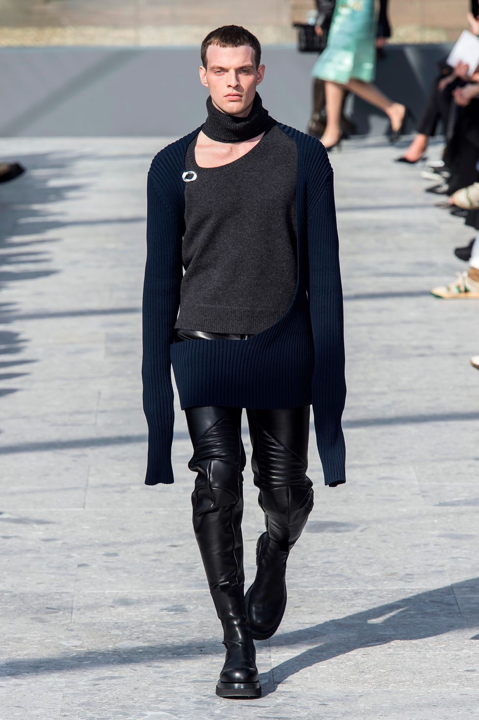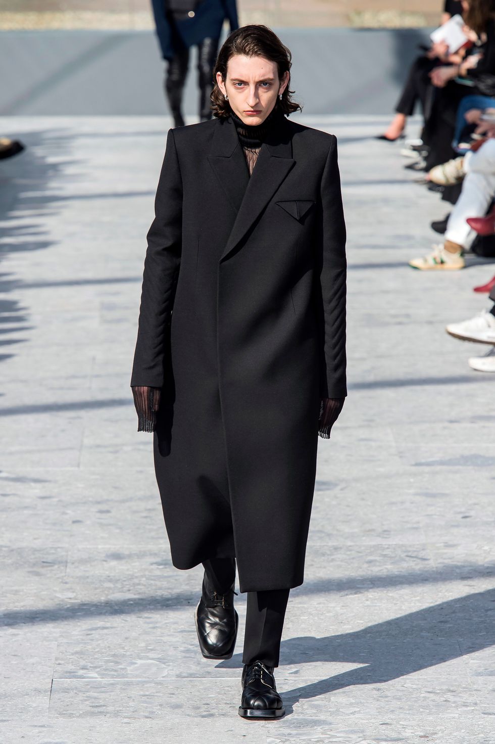 Women's coats were chunky and quilted, but still extremely flattering. For men, suit jackets were cut sharp and with triangular pockets. Sheer turtlenecks worn underneath played with the balance of proportions.