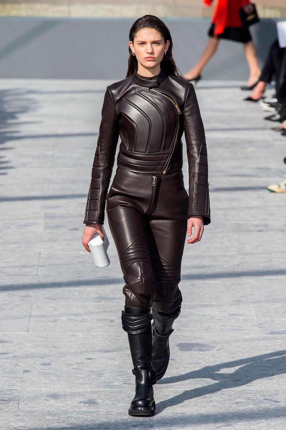 An all-leather outfit was designed to look like fashion armor for the future — or a really expensive and elegant motorcycle racing uniform. Leather pants for men and women had splices of extra padding above and below the knees — sometimes in contrasting colors.