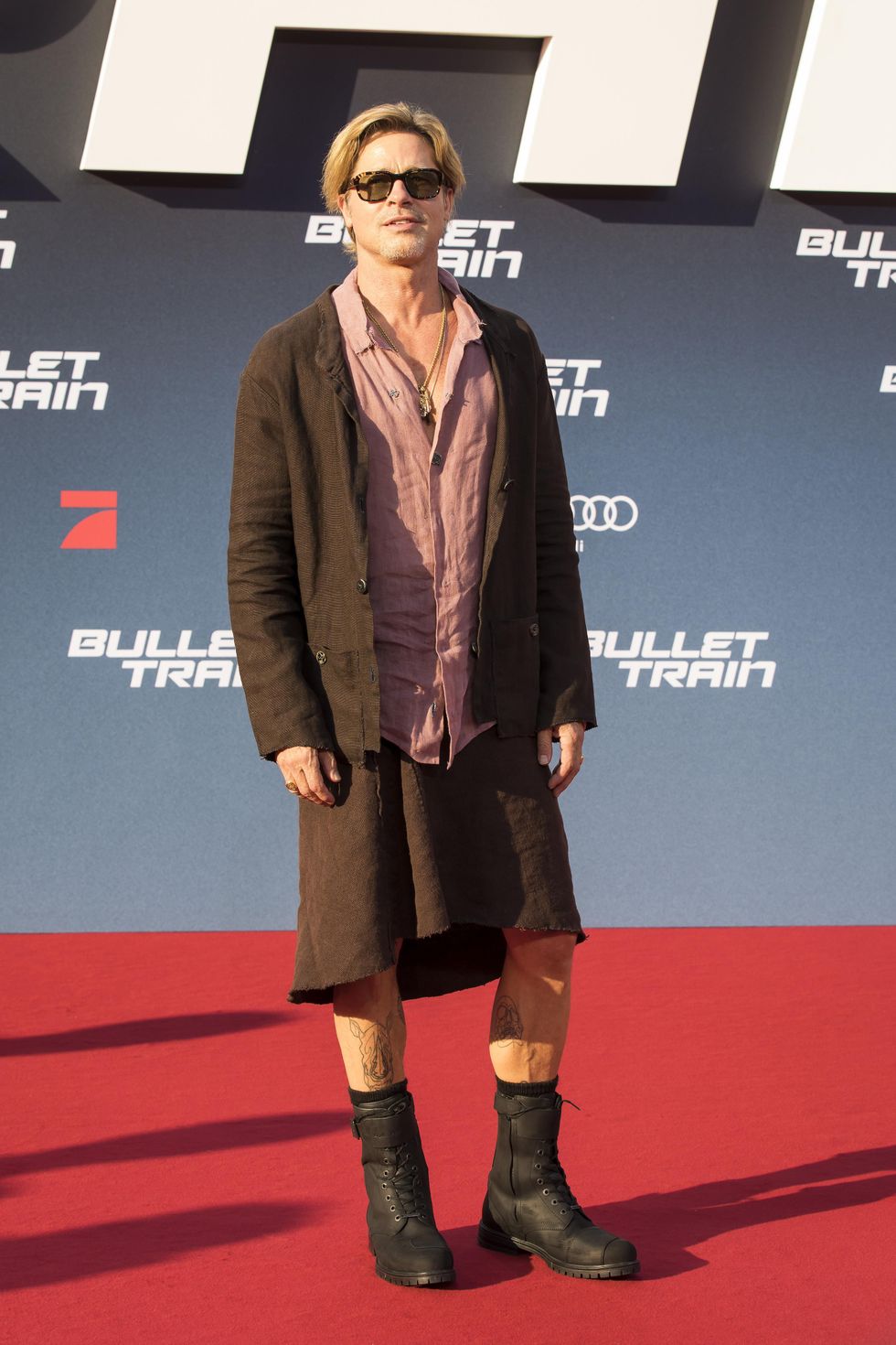Update 8/2/22: On Monday night at the Los Angeles premiere of his film "Bullet Train," Brad Pitt was asked by a reporter the reasoning behind the viral skirt he wore on the red carpet last week in Berlin. "“I don’t know! We’re all going to die, so let’s mess it up,” he told Variety (he wore a green suit this time around).