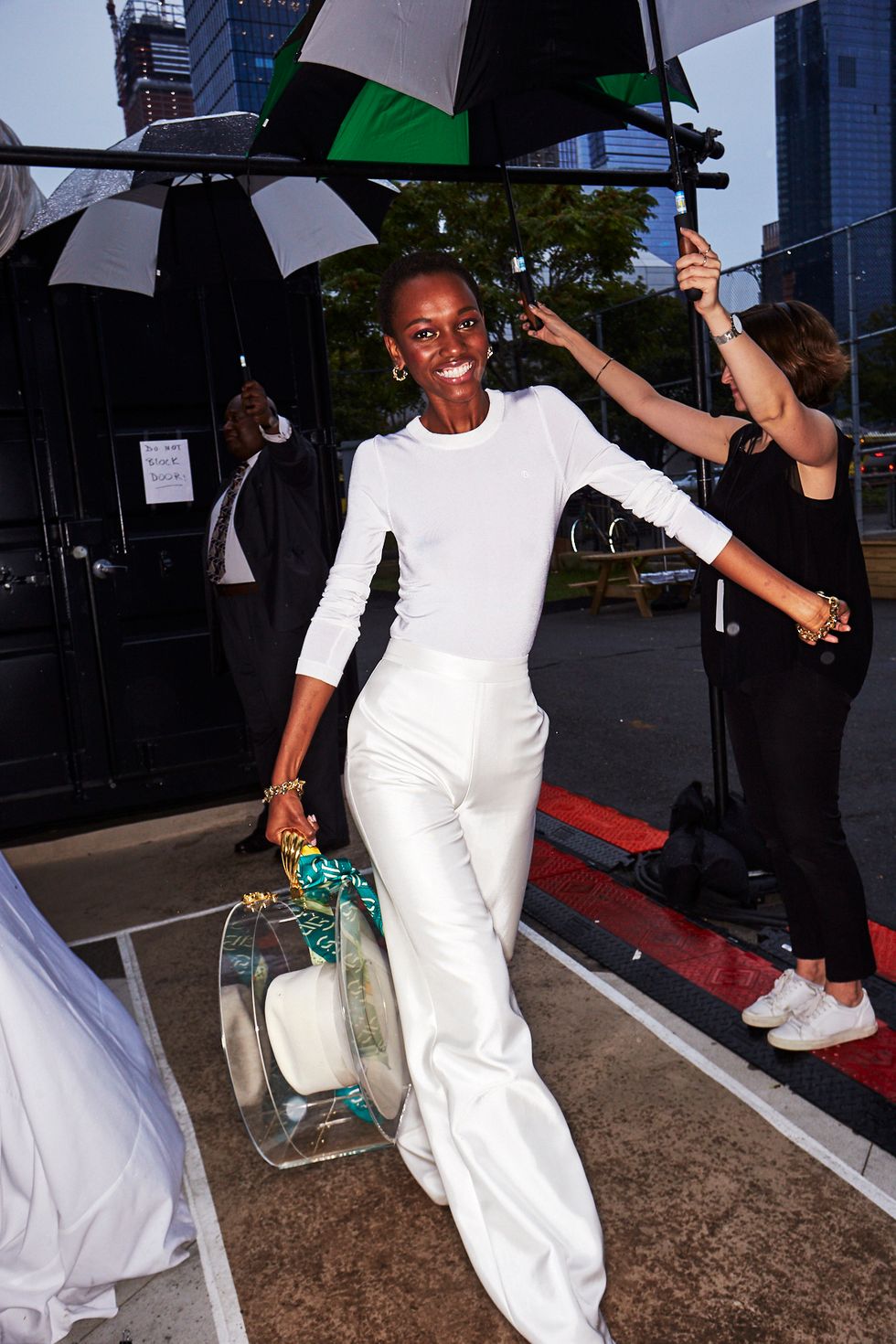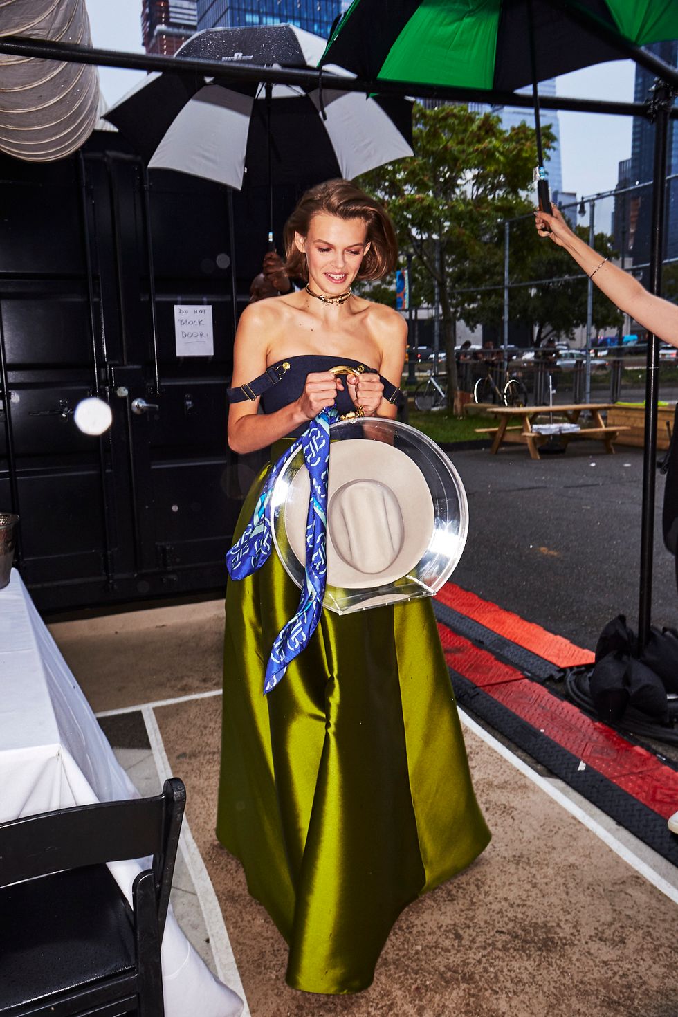 The collection's stand-out accessories were translucent acrylic hat boxes and rectangular cases with gilded handles shaped like a horseshoe. The former carried bottles of rosé with custom Brandon Maxwell labels, while the latter held red, gray, and white iterations of cowboy hats made in collaboration with Florida-born, New York-based milliner Gigi Burris. Trimmed with cotton grosgrain ribbons, the hand-crafted styles were informed by hats Maxwell's grandmother owned.
