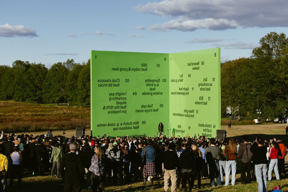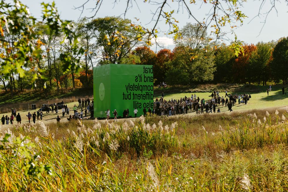 I opt to walk, wanting to experience the moment on the ground and not from the comfort of a crowded bus of Internet personalities making content about fall leaf colors. A Vitamin Water pop-up is handing out Brat green flavors. I take one, and almost gag, the flavor being a mix of various synthetic substances that produce the distinct taste of a powder I once experienced, after it’s been dislodged from the nose. I finish it anyway, nearly choking from the laugh welling up inside me again. The scenery has opened up, sprawling fields filled with sculptural marvels dotted with various Brat signifiers. A green wig. A TikTok-ready outfit. An influencer with a selfie stick. Gaggles of girls and gays, arm in arm, stomping towards the unknown. I passively hit my vape and fall back in line with friends I’d run into on the way, filling them in on all they missed since Brat Summer caused me to fall off the earth.