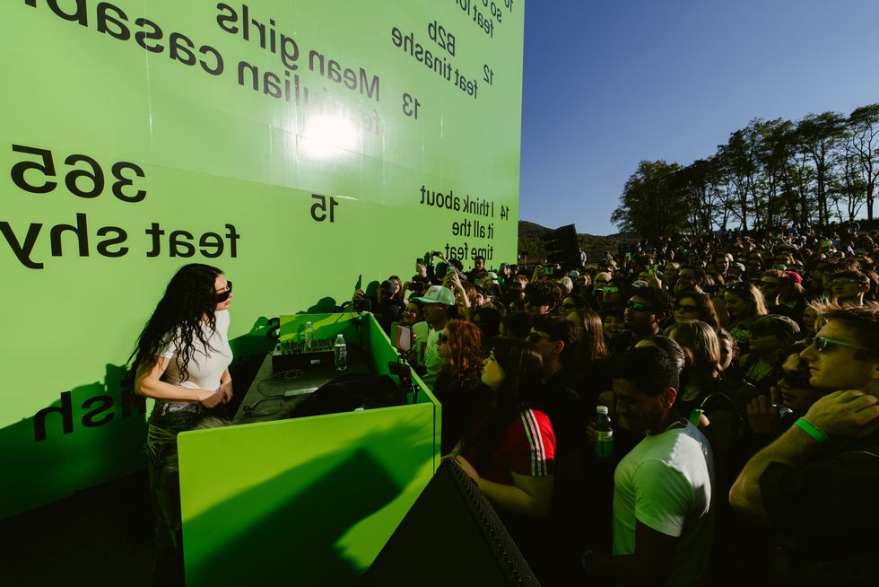 The giant vinyl installation comes into view, shaped like a classic gatefold LP In signature Brat green. Along the path are various vendors, free of charge, peddling drinks and food and limited t-shirts to commemorate the popup. We grab a giant pizza and head to the greens, slowly inching our way forward until I’m all but five feet from her DJ booth. Perfect. Over the next twenty or so minutes, the crowd spontaneously erupts into cheers as a random person with a shockingly similar haircut to Charli is spotted over and over again to the booth’s right. I spot her creative collaborator Terrence O’Connor, and elsewhere, O’Connor’s fiancé, TikToker Benito Skinner. Likely place for him to be. The crowd closest to the booth is a who’s who of press and New York socialites and the sort most likely to tweet that they should have been in the “360” video over so-and-so.