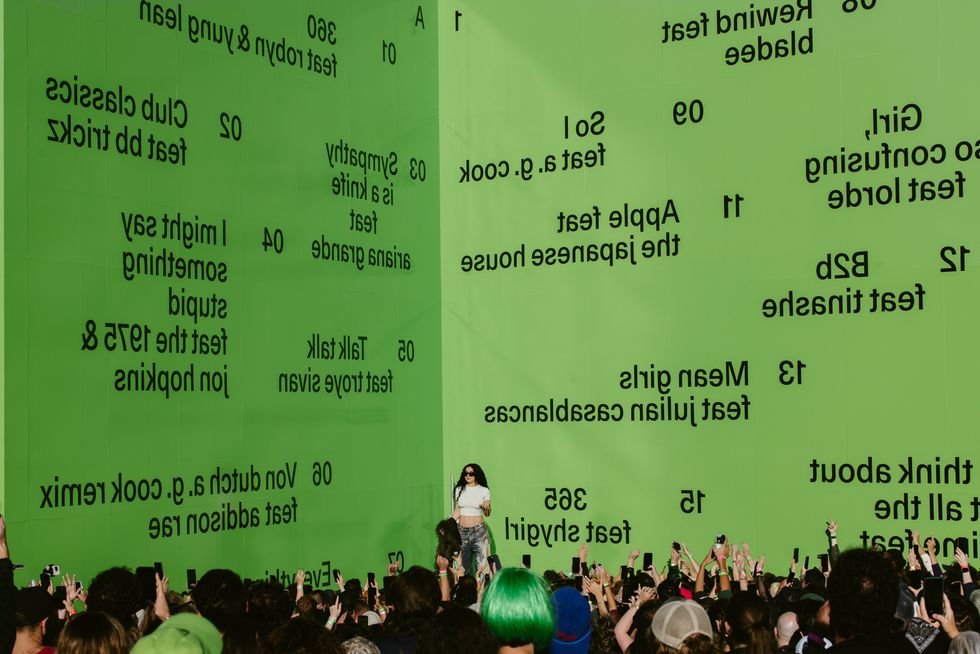 An hour or so out the scenery changed, and the incomplete Brat and It's Completely Different but Also Still Brat remix album looped back around on itself to the "360" remix. The complete tracklist had been public for a week at that point, and I laughed, thinking about the various wishlist collaborators people would chant for, or the scorn from younger fans when faces like Julian Casablancas or The Japanese House or even Bon Iver emerged on the tracklist. Why not so and so? Where’s this and that? From my estimation — later proven, by various monologues that accompany the listening party to come — Charli is broadly disinterested in what the album should have been. Or even what it must have been. Brat, by her own admissions both in the lyrics and offline, is an album about doing whatever she wants, with the people she feels like doing it with. Label expectations and chart performance and commercial viability be damned. Very Brat, after all.