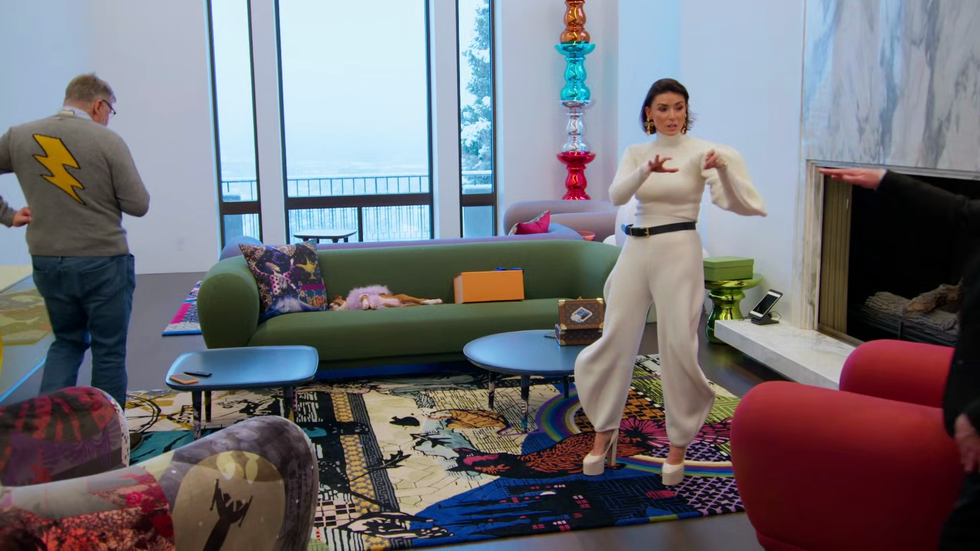 It’s not all bad, however. She debuts two new confessional looks this episode, which we’ve been front-loaded with this season. Unlike that first dress, this dress is an exquisite color on Meredith. Shoutout jewel tones! The hair is right, her glam is right, and the twist at the sleeve is just playful enough to escape a scathing remark from me. Anyway, want to watch that Jenna Lyons TikTok video with me? It’d be more productive than attempting to talk about her cream blazer.