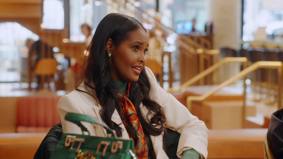 Then we have the accompanying look from the same scene in real-time, which is a nice bit of color-blocking: modest blazer and contrasting undershirt with a silk scarf and a nice pop of green at the ears. The matching purse might read tacky, but it works here in totality! Kudos, Ubah.