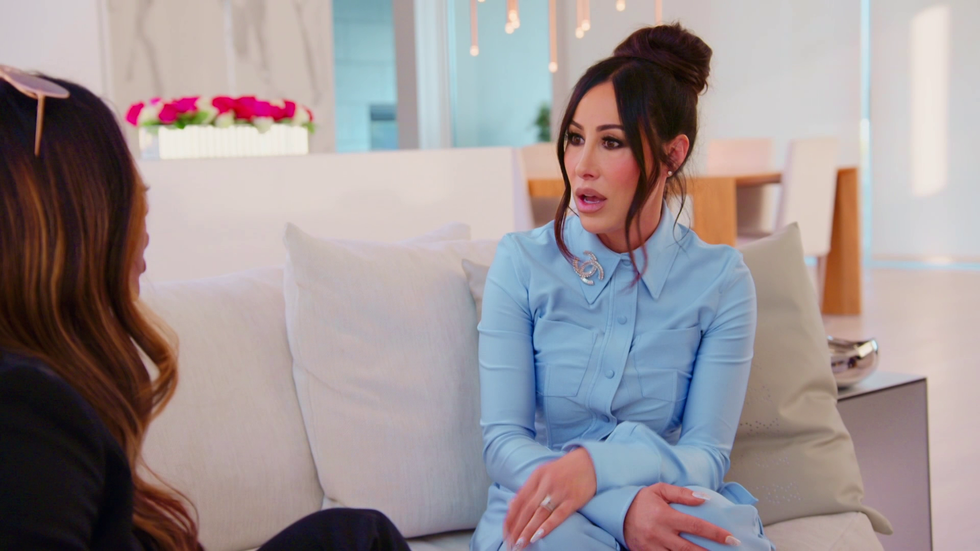 The context of this scene is heartbreaking. Mary finally opens up about her son’s battle with addiction, and the torment she’s put herself through wracking her soul for what she did wrong as a mother. Angie, likewise, is also a mother. As such, she wore a sensible blue co-ord set with a prominent updo and a large Chanel brooch. Demure, soft and exquisitely rich. The look of shock in her heavily-lined eyes adds to the drama of the moment, lifting it up out of the Bravo lineup and into the pantheon of Pedro Almodovar movies.