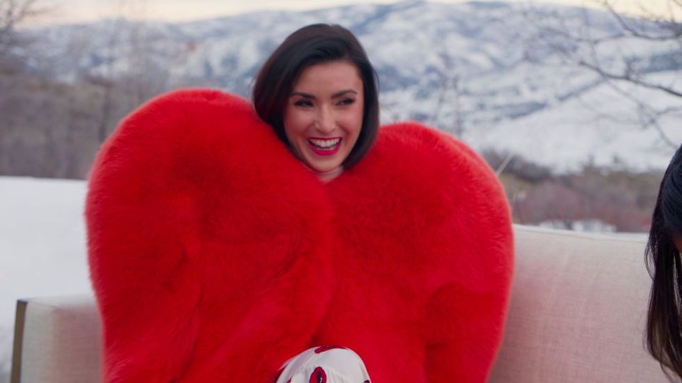 Speaking of Dolce & Gabbana, here comes Bronwyn in a matching quilted set in the freezing Utah winter. Love and light to everyone involved, but she could have kept this one in the drafts! At least wear sheer tights for the big fashion moment, which is both appropriate for the look and would have helped it not read like a bad Netflix scripted comedy show joke about what rich people wear. The coat is fun, sure, but was it worth the humiliation of strolling into the poor Utah imitation of a Soho House in hot pants, a bra and block heels?