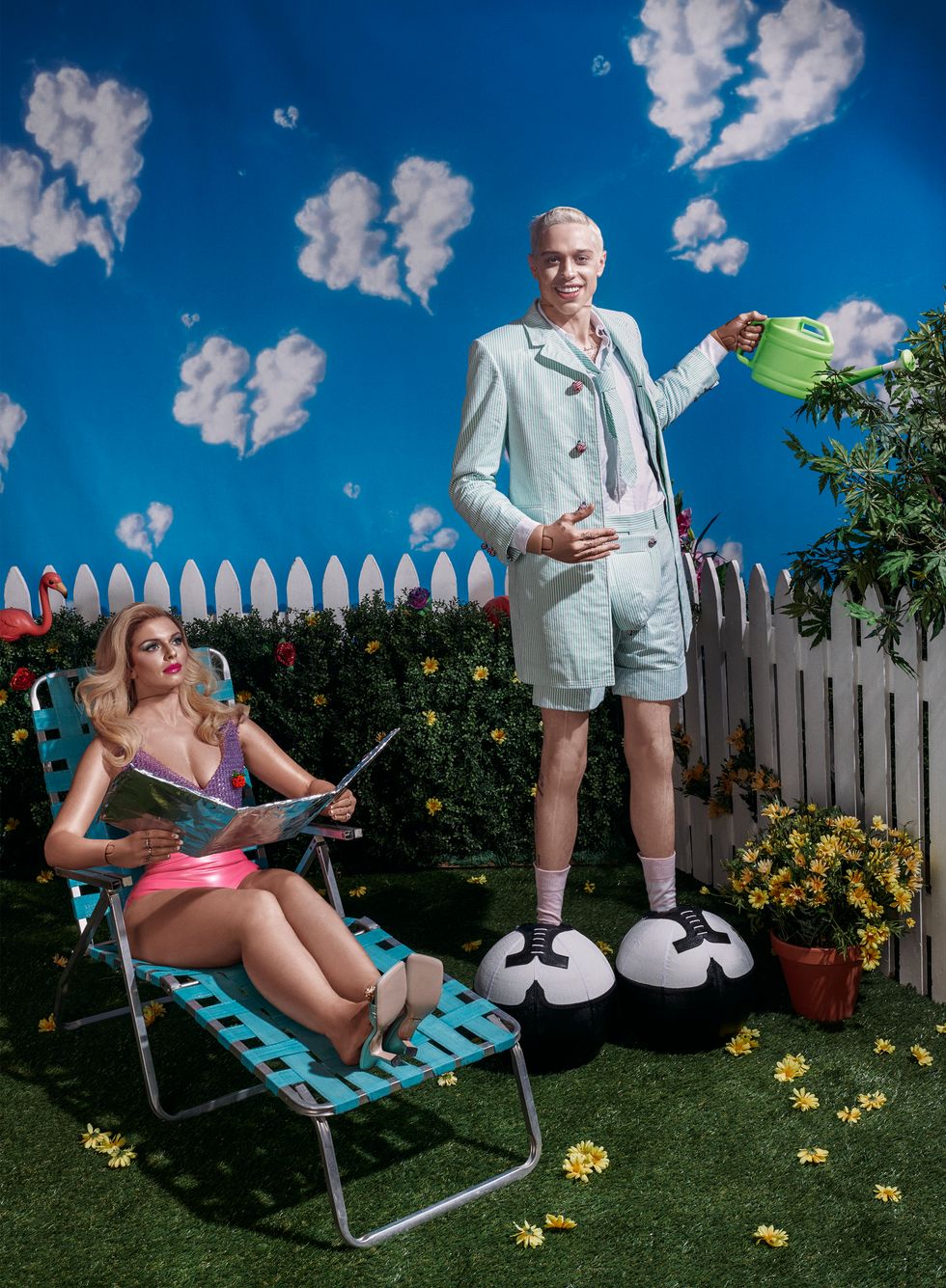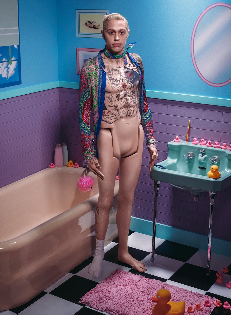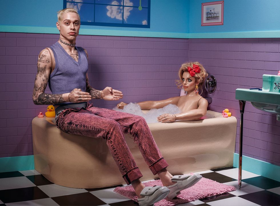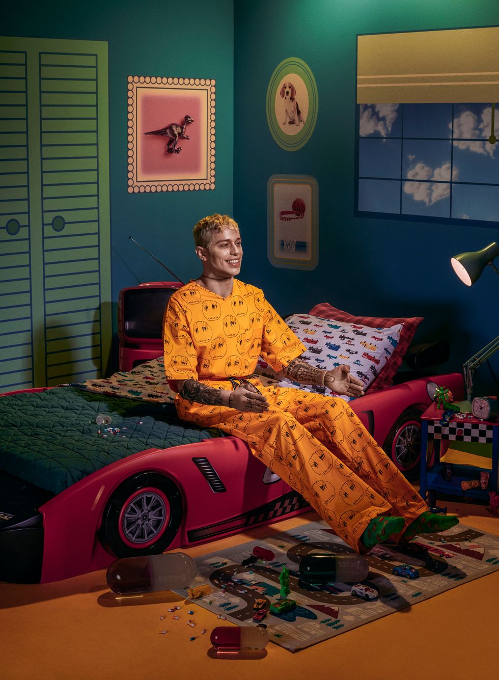 We'd spent the summer getting close; he even came to WorldPride with me. In a car, on our way to set for his new movie with Judd Apatow, we brainstormed ideas for our upcoming shoot together. I threw out a Ken Doll concept. It seemed right since tabloids manipulate people in that way, him especially. He was down with the idea, but challenged me to go darker, something that leaned into his struggle with depression, which he has been admirably public about. He'd told me he slept in a car bed as a kid and I saw it immediately: this Staten Island Ken Doll version of Pete stuck in a Barbie nightmare, pills everywhere. "You'd be like depressed Ken," I said.