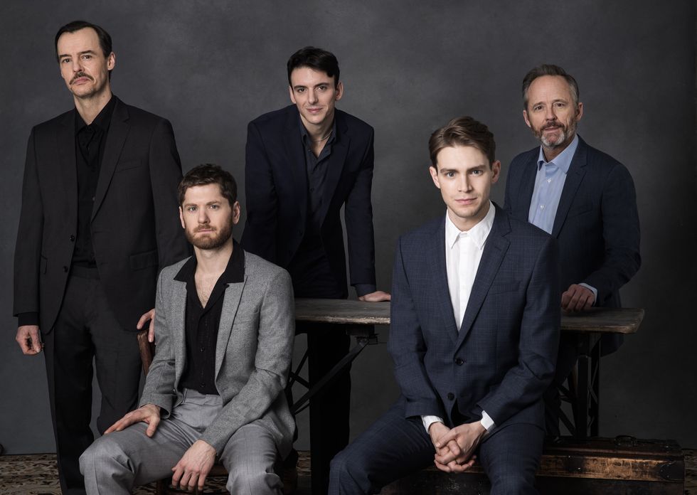 (On Paul) Suit: Hugo Boss, Top: Burberry; (On Samuel) Suit: Hugo Boss, Top: Giorgio Armani; (On John) Suit: Hugo Boss, Top: David Donahue; (Oh Kyle) Jacket: Topshop, Top: Saint Laurent by Anthony Vaccarello, Pants: Hugo Boss; (On Andrew) Suit: Hugo Boss, Top: Eton, Shoes: Salvatore Ferragamo