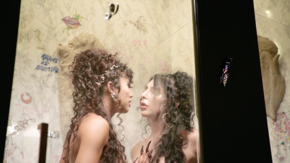 Every scene was so exciting to create from scratch, but the general aesthetic of Act 3 was my favorite. It was inspired heavily by fantasy, mythological folklore, and ancient Egypt. Will Sheldon, one of my favorite tattoo artists, painted the murals on the wall, which have a bit of an elf punk aesthetic. And Luis Ortega helped me to realize my vision of the glass glory hole bathroom stall. My art director Claire Barrow helped me to assemble the team, and pulled in amazing artists like Sarah Nicole Francis who did animation and Nic Seago who edited. Leya scored the film with live harp and violin, and Sega Bodega helped sprinkle some magic to the vibe with his sound design. We also featured art from Jeanette Hayes, and graphic design by Toby Evans and HARD.