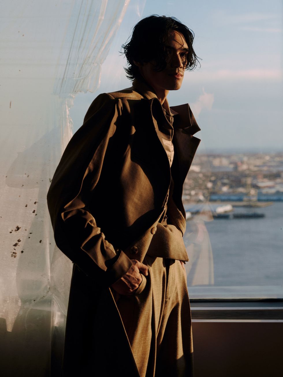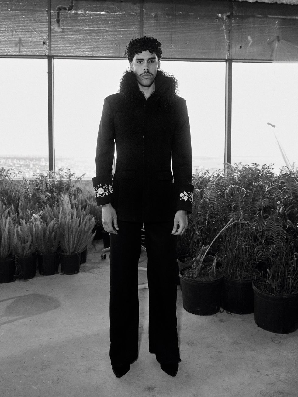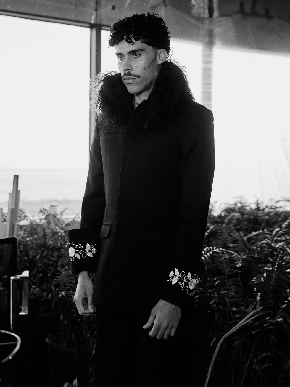 On the day we met, Patricio Campillo was wearing a look of his own design — skillfully tailored, quintessentially Campillo, featuring a golden set of aviator eyeglasses and Dries Van Noten shoes. In the Ridgewood studio that served as the staging ground for Fall 2025’s collection “Fictions of Reality,” a proverbial garden of coffee flowers was splayed across sleeves, coats, and collars.