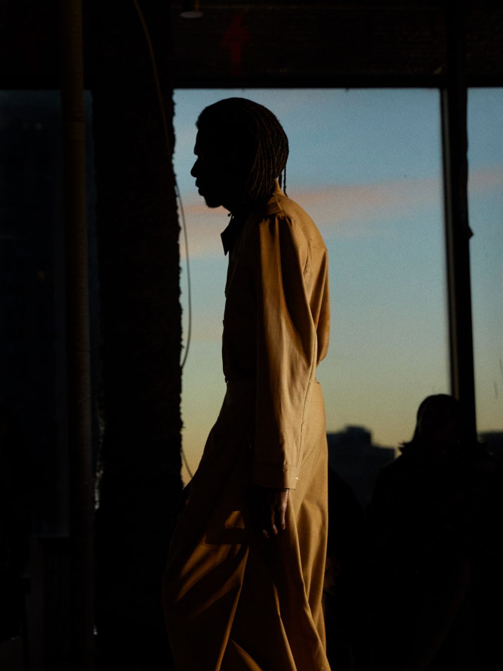 As the last model dipped under the dressing-area curtain, Campillo made his closing appearance, jogging down the runway and coming to a stop in front of a beaming bank of lights – satisfied, determined, expectant.