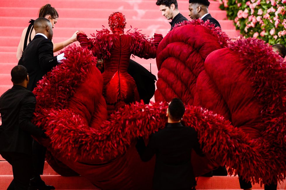 The pillowy dress was topped with a Daenerys-worthy bejeweled breastplate and puffs of feathers on each shoulder. In turn, her bejeweled tits were topped with 44-carat ruby nipples that each cost more than an undergraduate degree at Stanford or a midtown condo, cashing in at $250,00 per nip. Because Cardi, who's been a Met Gala winner two years in a row now, is worth it.
