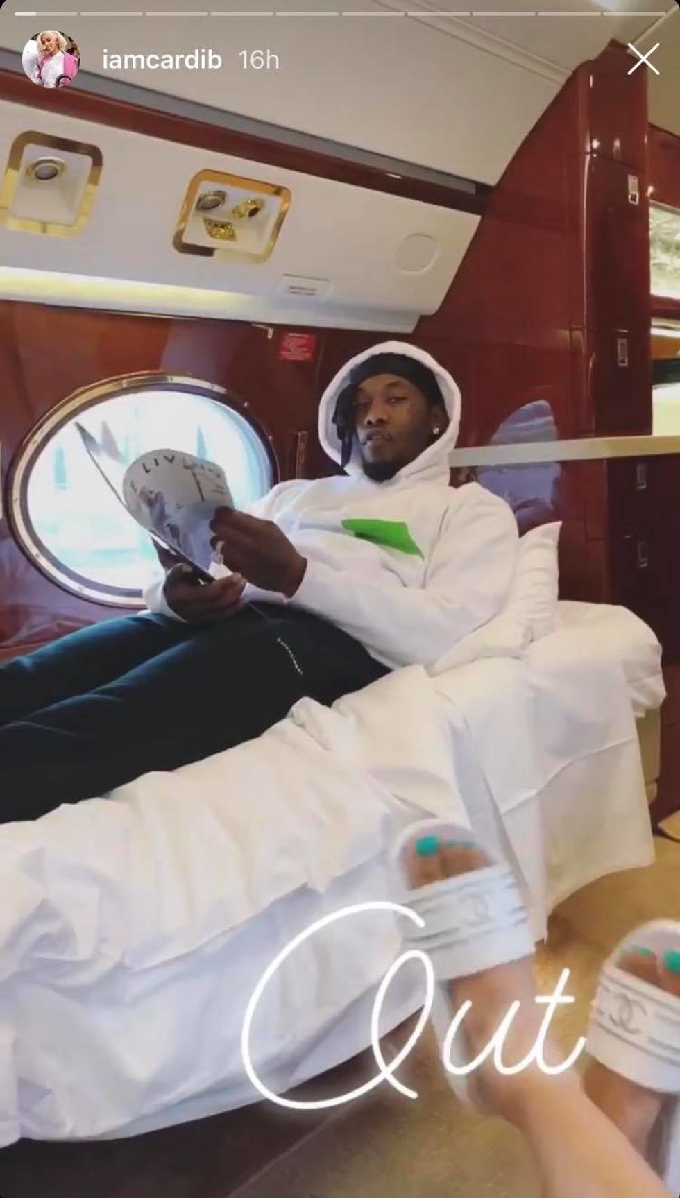 However. However. The on-off couple, who announced divorce plans late last year, have been making a big effort to patch things up lately. And the look of love Offset is currently giving Cardi on her Instagram story is pretty damn convincing. As she directs the phone camera his way we see that they're dining on a decadent lobster dinner (when she's not eating cereal, Cardi has a well-documented weakness for crustacean), while "Wonderwall" by Oasis plays in the background. Wait, is "Wonderwall"... their song? Somehow that would explain a lot.