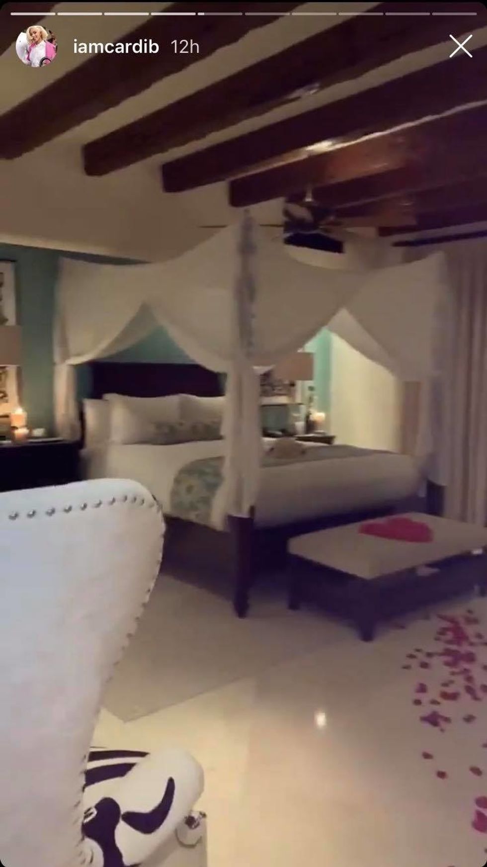 Cardi and Offset are reportedly on vacation in Mexico, and elsewhere in the video we see them recline in a private jet together, then arrive at what's presumably the honeymoon suite of a five-star hotel. Rose petals trail towards a luxurious looking four poster bed. There's a cheese platter. Candles. A bathtub with one of those fancy teak trays lying across it. Basically, as we might have guessed from all that red carpet PDA, the marriage is very much back on.