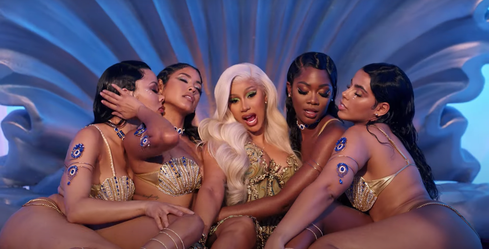 In the scene where she's perched inside a giant clam, Cardi is serving mermaid couture thanks to her baroque porcelain-finish corset, hip piece, leg pieces, matching handpieces and stripper heels by the renowned makeup artist Joyce Spakman.