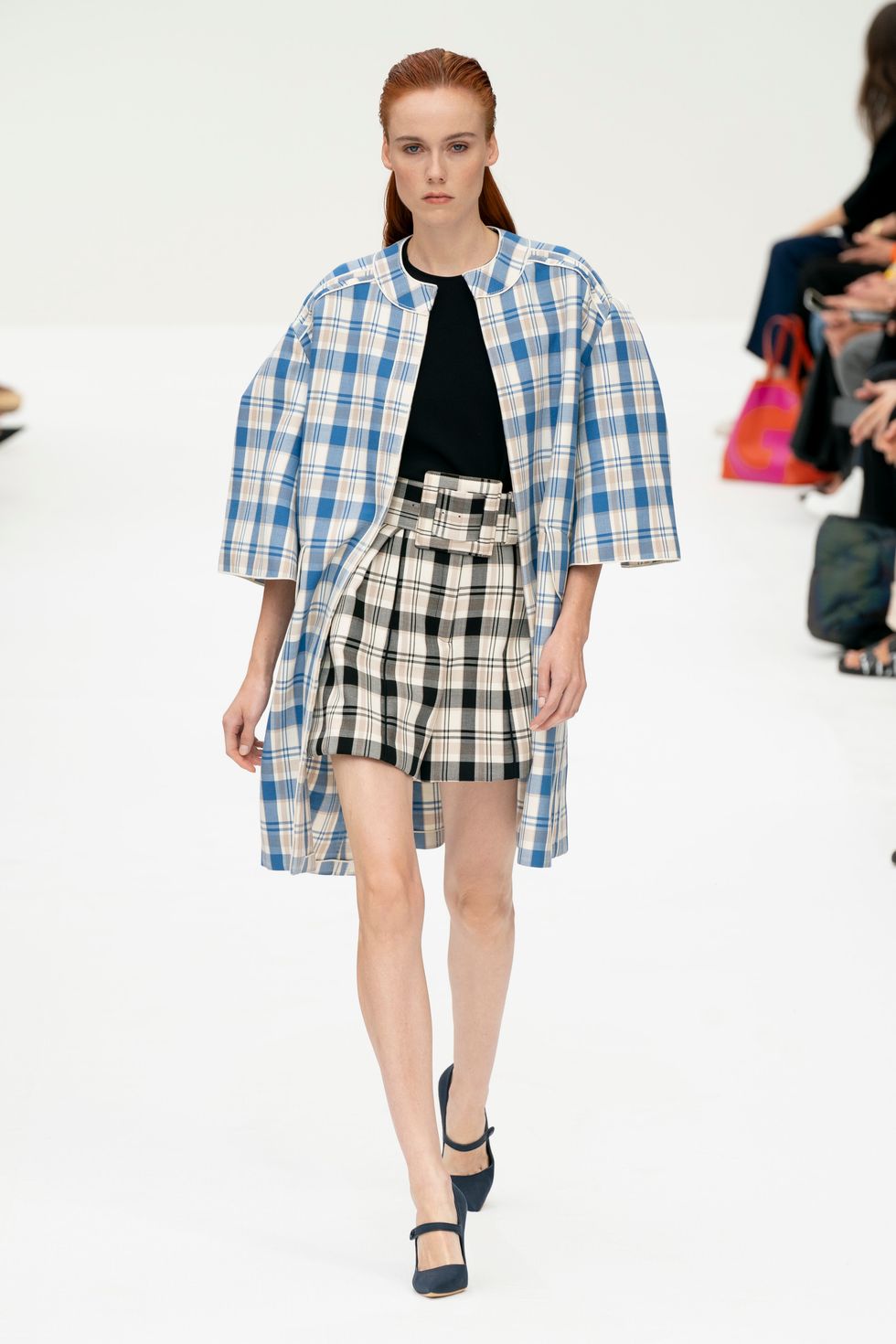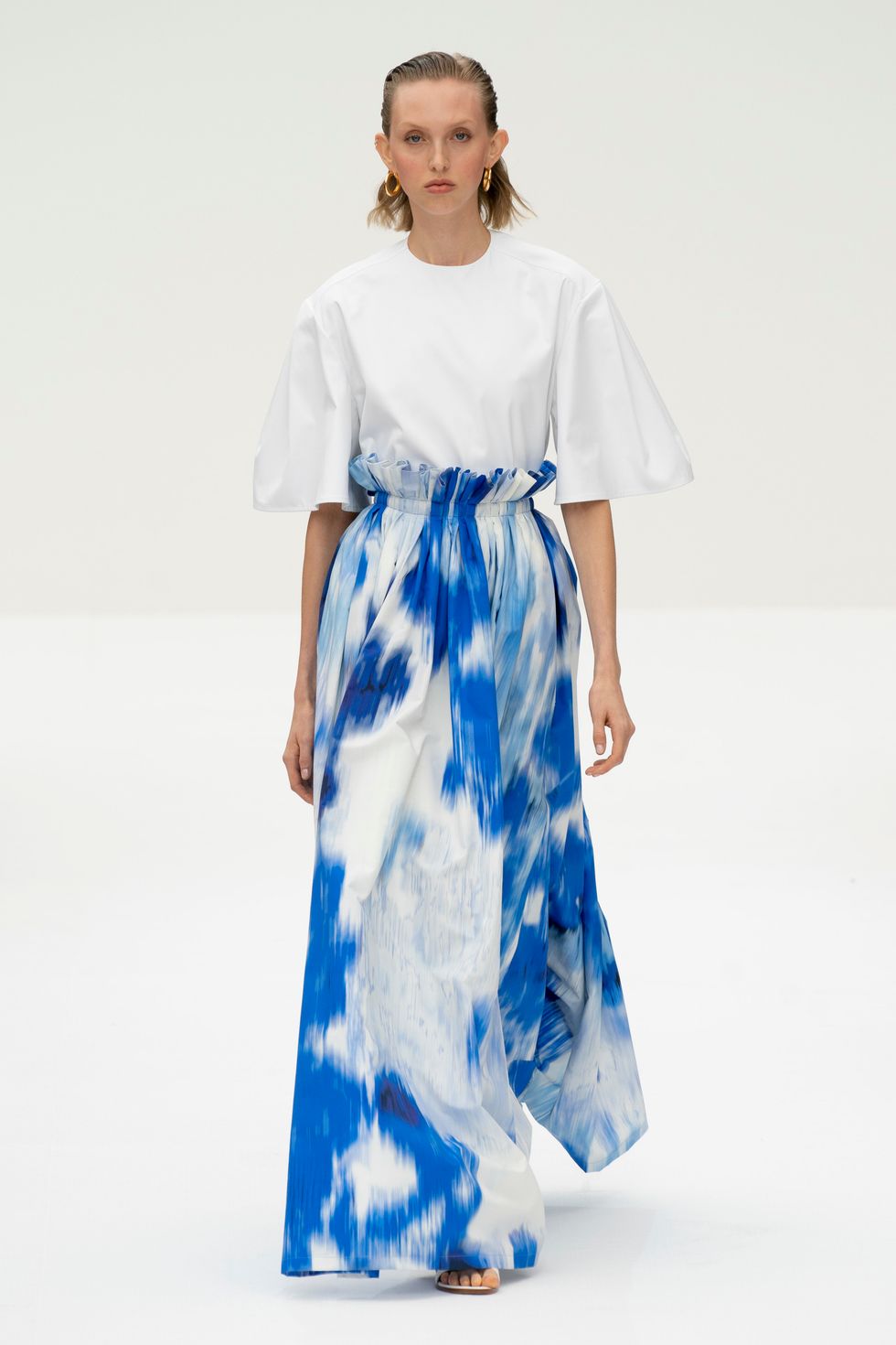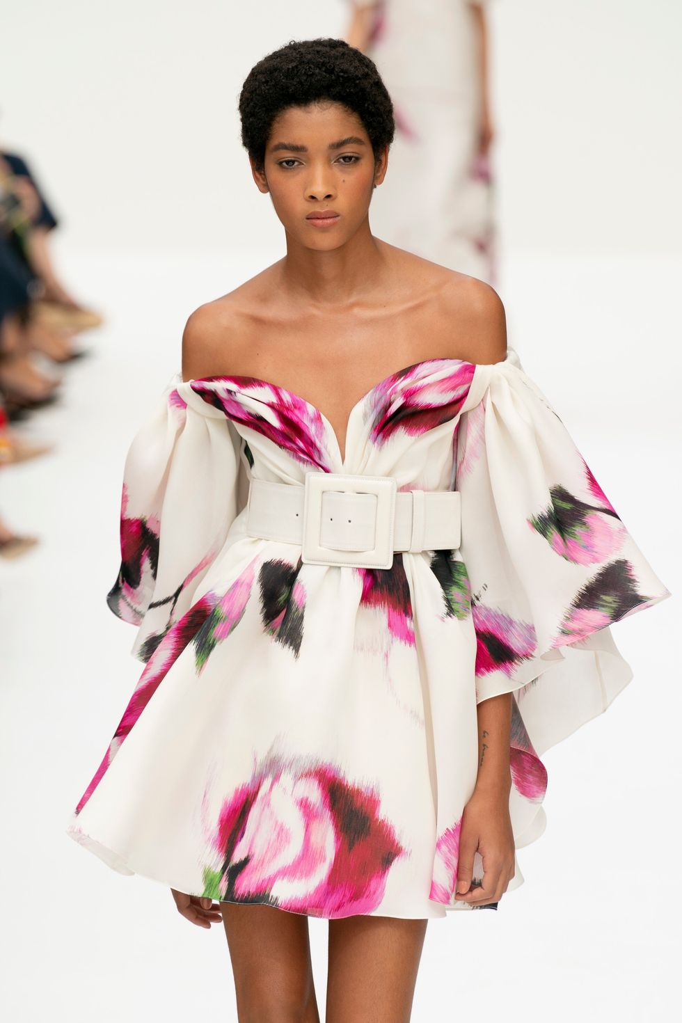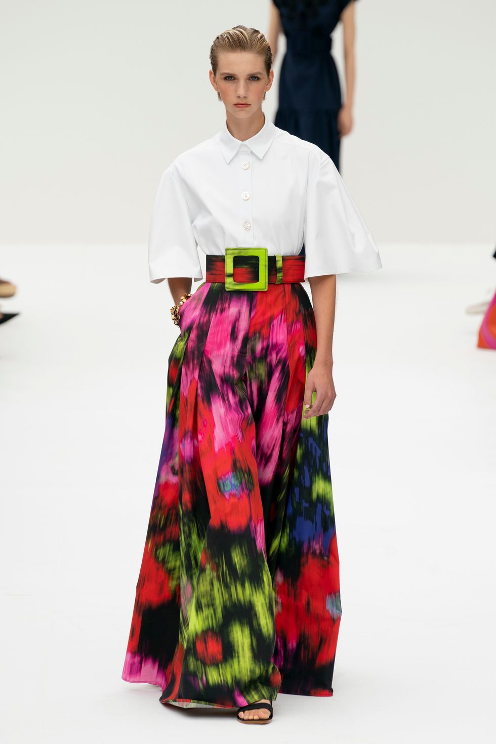 The crisp white shirt is classic Herrera, but Gordon utilized abstract, stunning floral effects on belted skirts that looked new and fresh. He was inspired in part by the superbloom in California, which formed the basis of the colorful prints.
