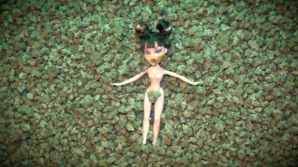 In one particularly iconic moment of the video, Ceci and company reimagine the American Beauty dream sequence where Mena Suvari lies in a bed of rose petals. Instead, the Bratz doll that plays Ceci in the video is "casually in two pounds of high grade primo Cali weed. Nothing gets more LA than that."