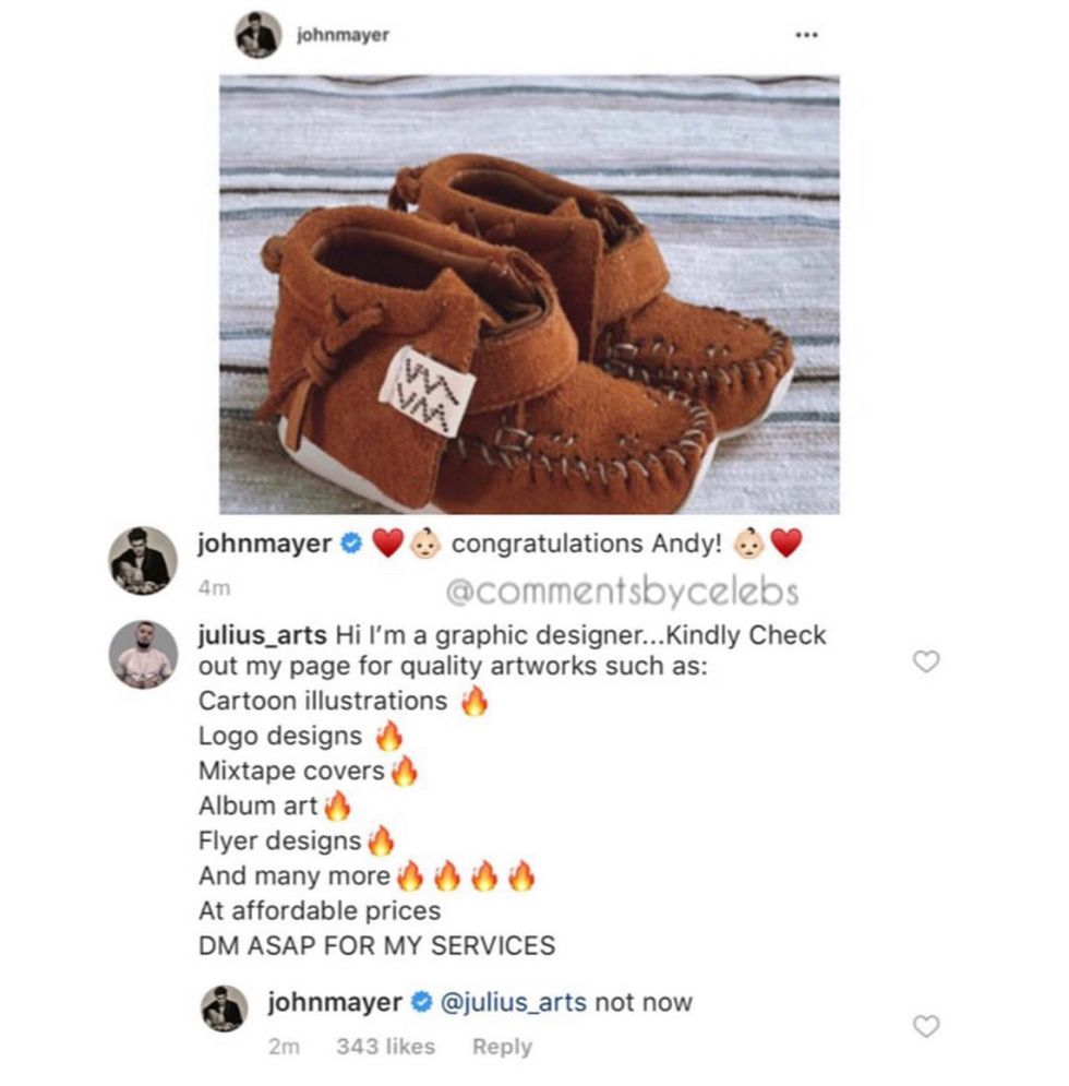 Simply, over the last six months or so, there has been a sudden surge of spam accounts making their presence known in the comments section of famous people's Instagrams. While they are all similar in terms of their repetitiveness, the content matter really spans the spectrum. We're talking everything from sex bots, whose comments often warn users not to look at their stories unless they want to masturbate, to eager graphic designers, self-promoting by using a wide array of emojis to convey their creativity. We've also got the aspiring musicians and meme pages, who employ the innovative tactic of inciting curiosity, with lines like, "1 million people already liked my picture, don't you want to know what it is?" Well fuck, now I kind of do.