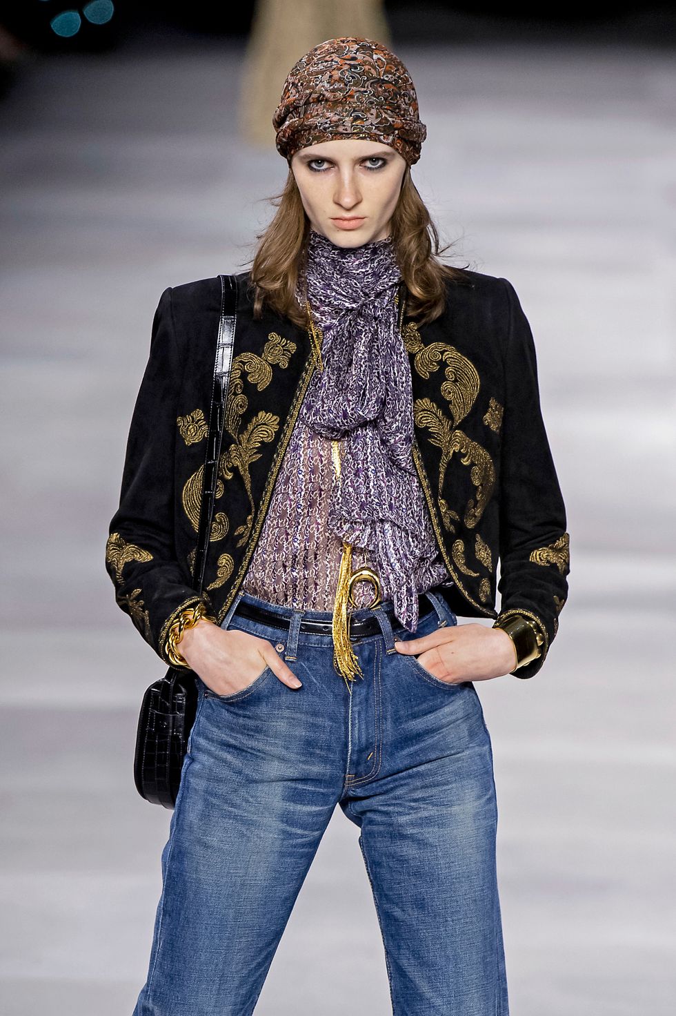 The classic bootcut jean in a medium wash was heavily used throughout, worn with platform heels or tucked inside boots.