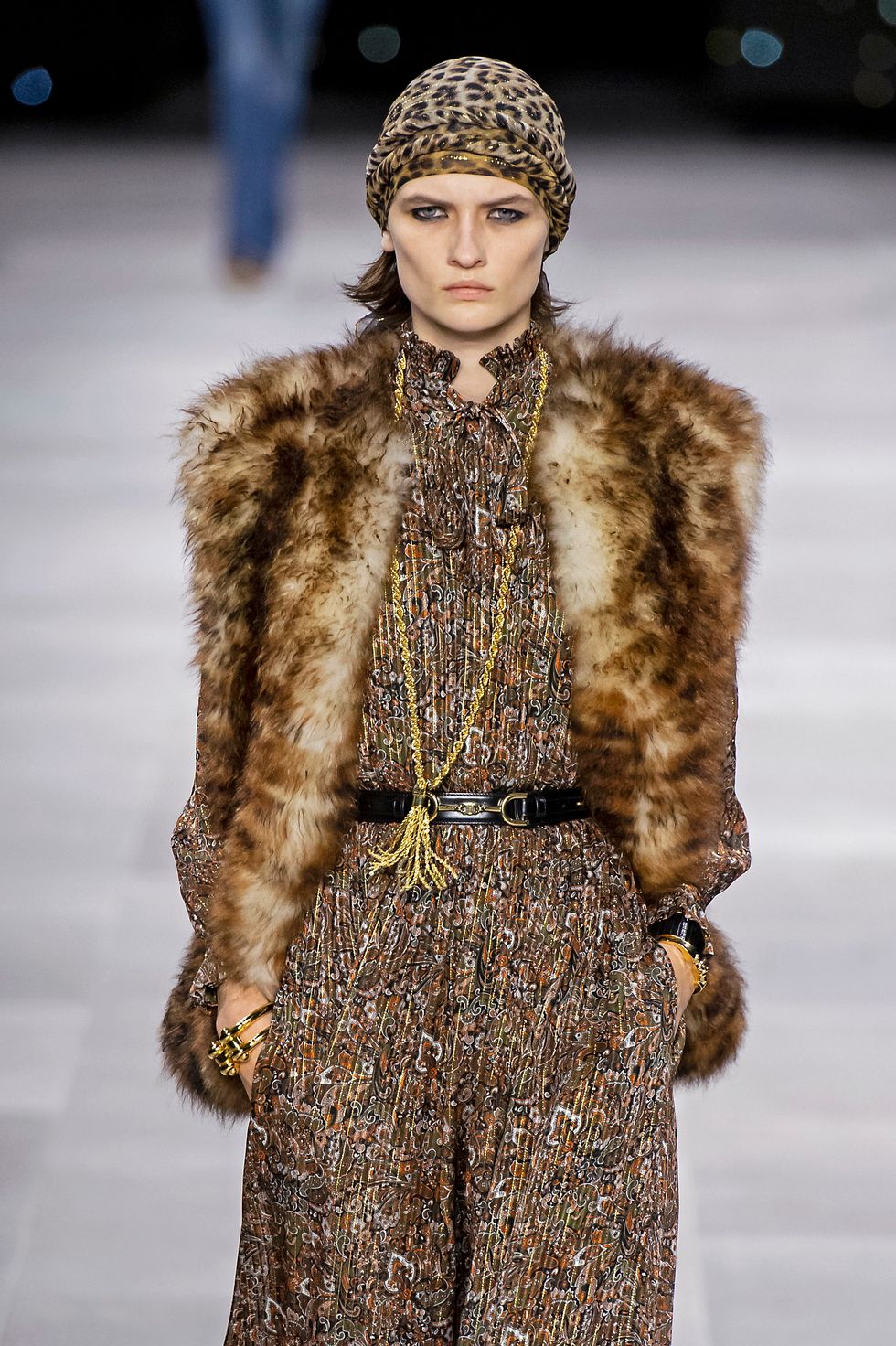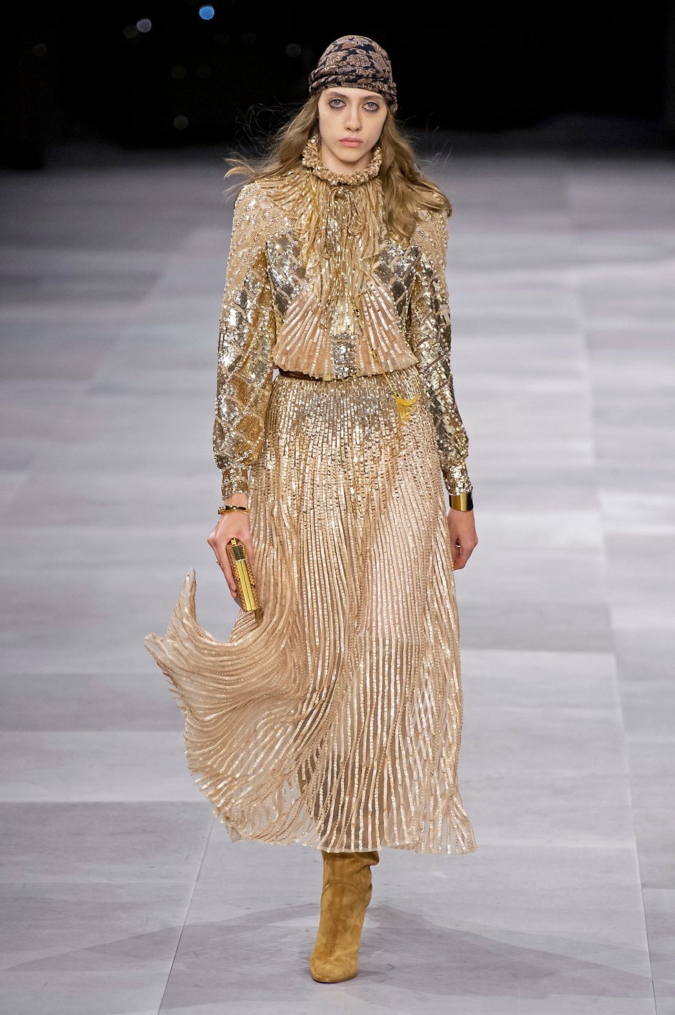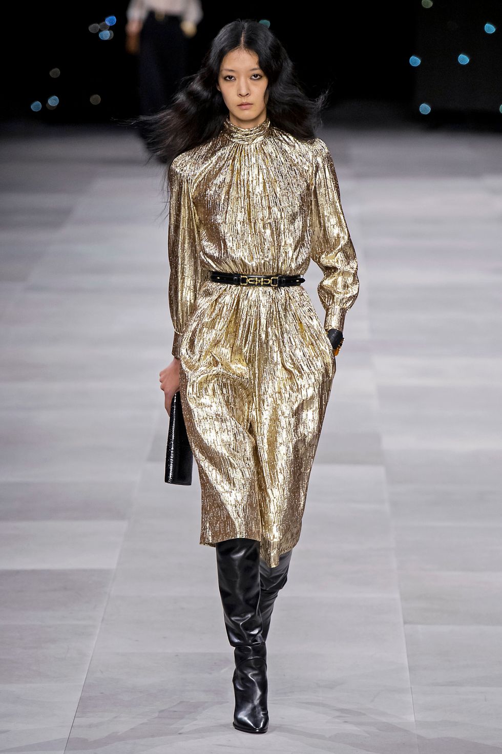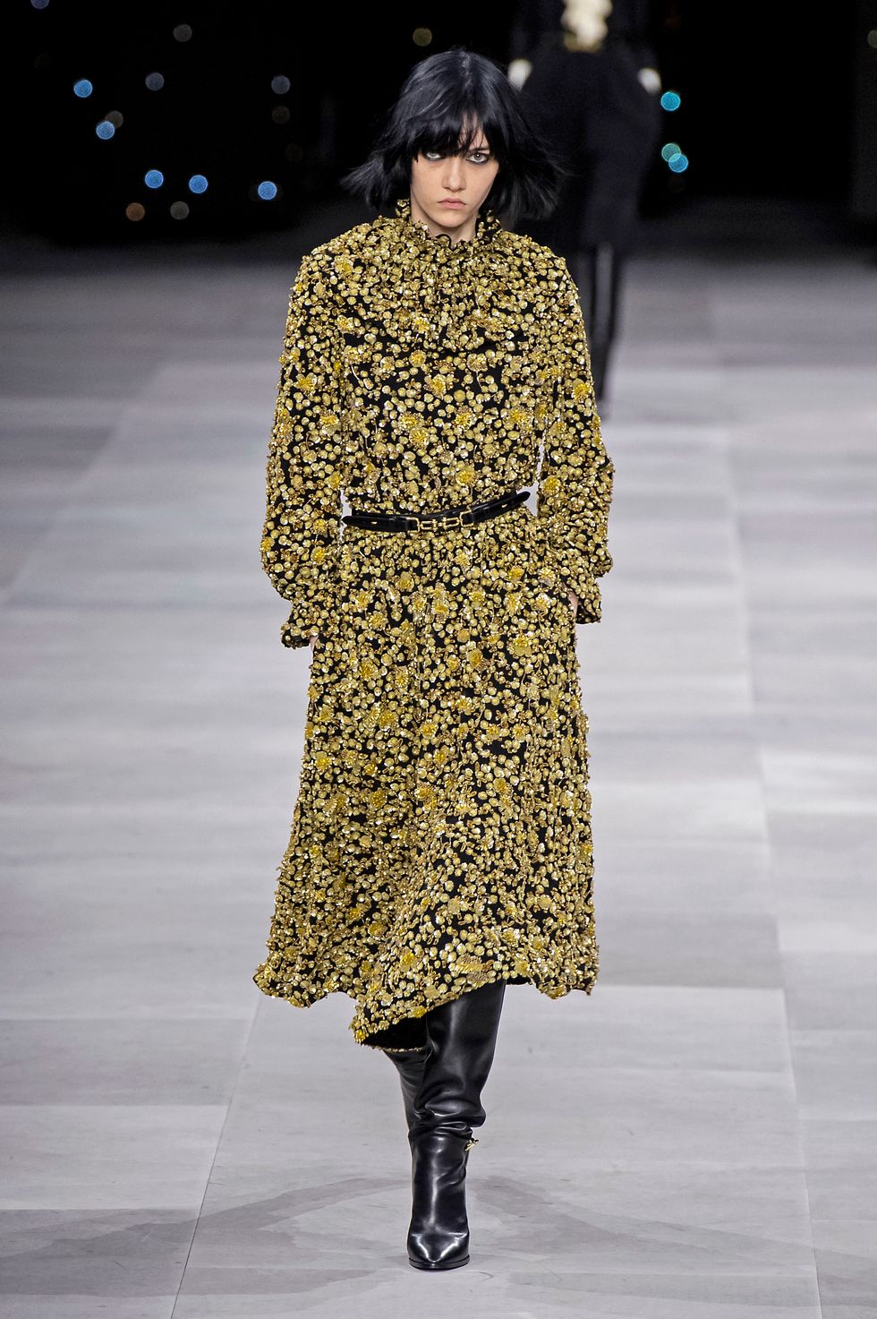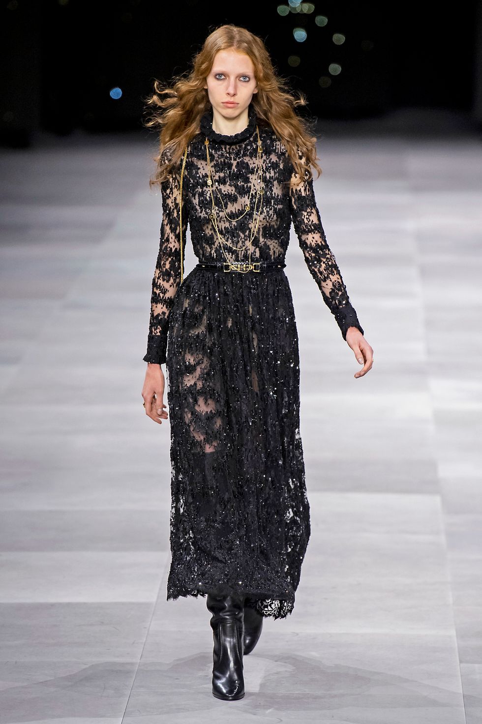 Slimane did add in some sultry eveningwear looks toward the finale, including dresses with gold embroidery and lace detailing for those late Parisian nights.