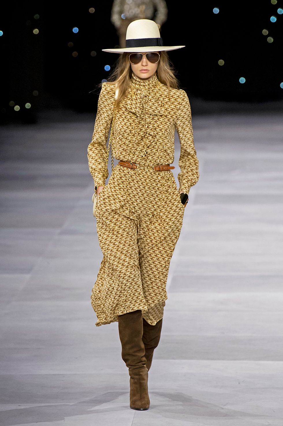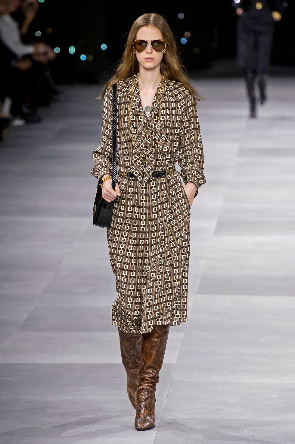 The main silhouette for Celine this season is a printed midi dress with a pair of knee-high leather boots.