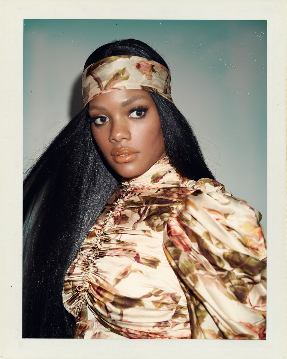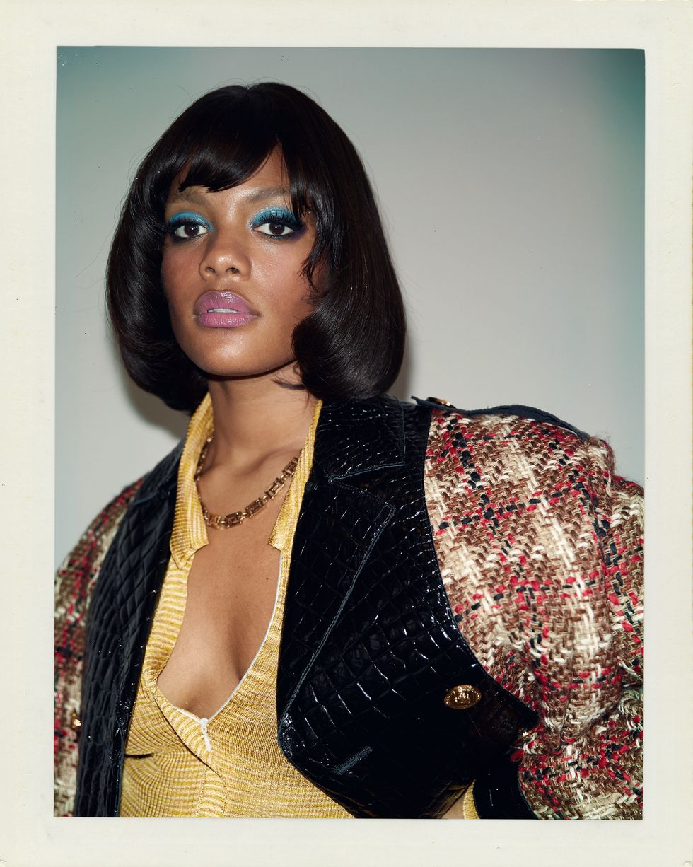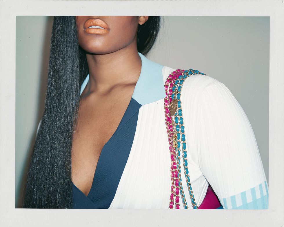 Bodysuit: Dior, Tights: Wolford, Earrings and bracelet: Jennifer Fisher, Necklace: Versace, Shoes: Giuseppe Zanotti