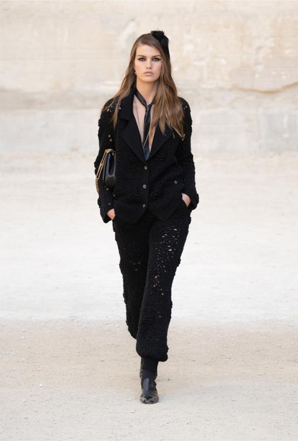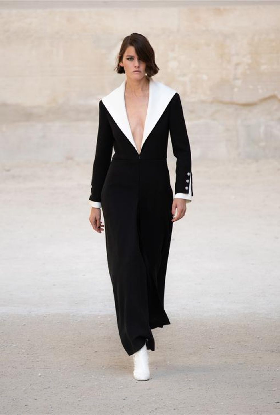The show was filmed in the limestone quarries of the Carrières de Lumières in Provence, one of the same settings in Jean Cocteau's film Testament of Orpheus, which was the starting point of this mostly black and white collection. (Cocteau and Coco Chanel were apparently quite close.)
