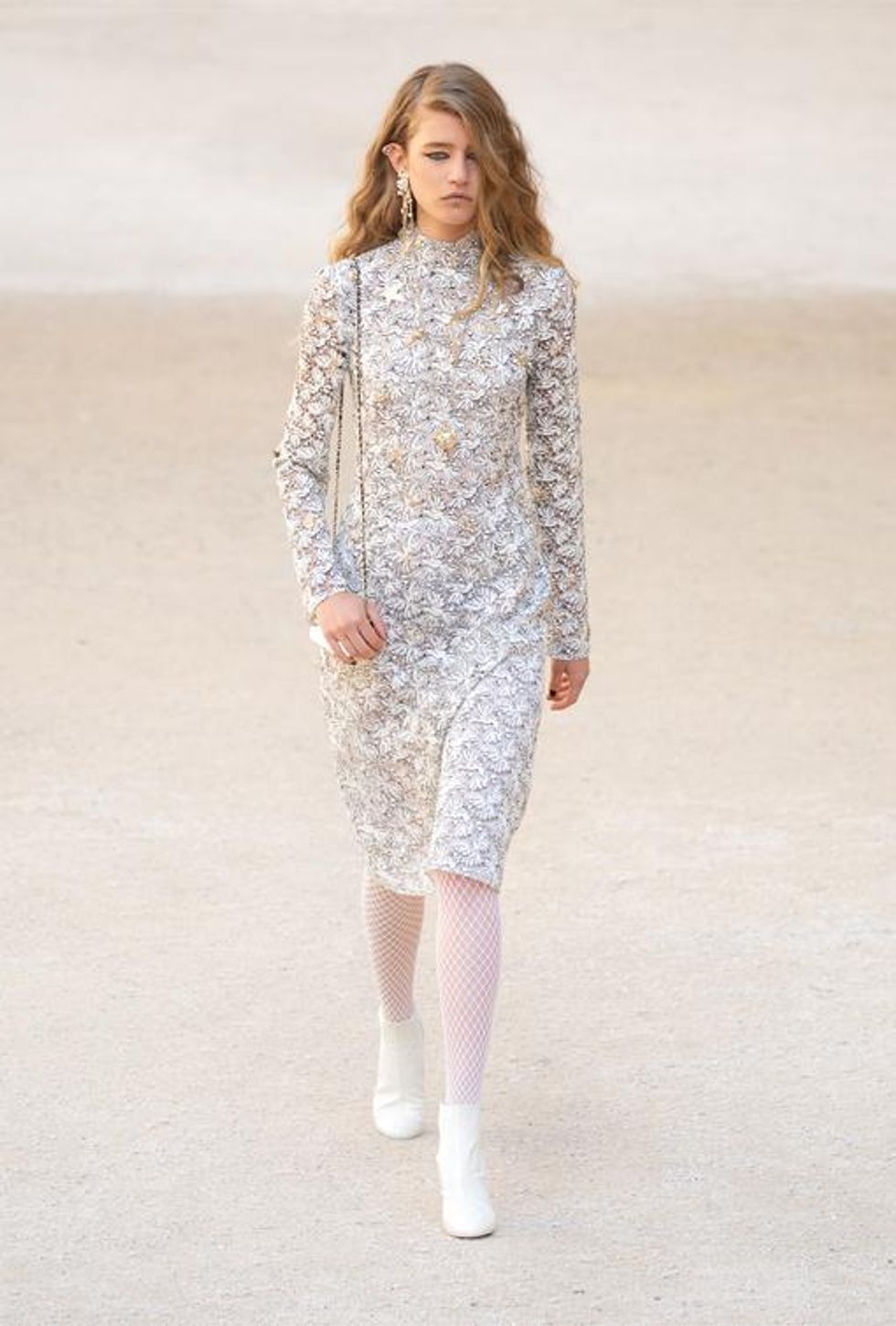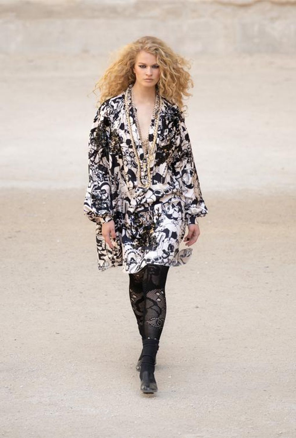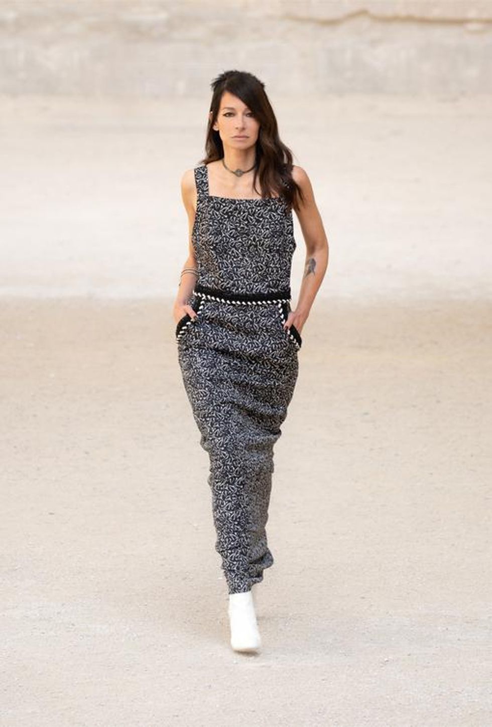 According to Vogue, the late supermodel Stella Tennant inspired the double-C lip piercing jewelry, a nod to her both her aristocratic and punk background. This being the rarified house of Chanel, of course, it wasn't all rock 'n' roll references — breezy caftans, '60s mod shapes, demure tweeds and A-line skirts brought the collection back to its Parisian roots.
