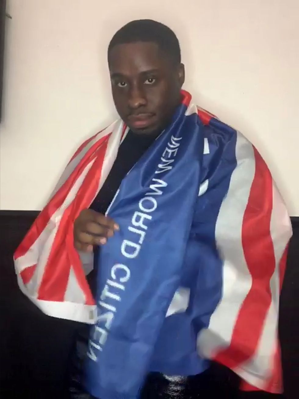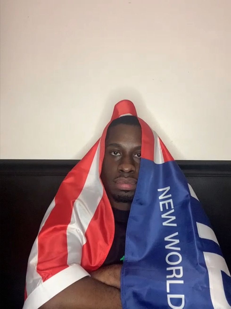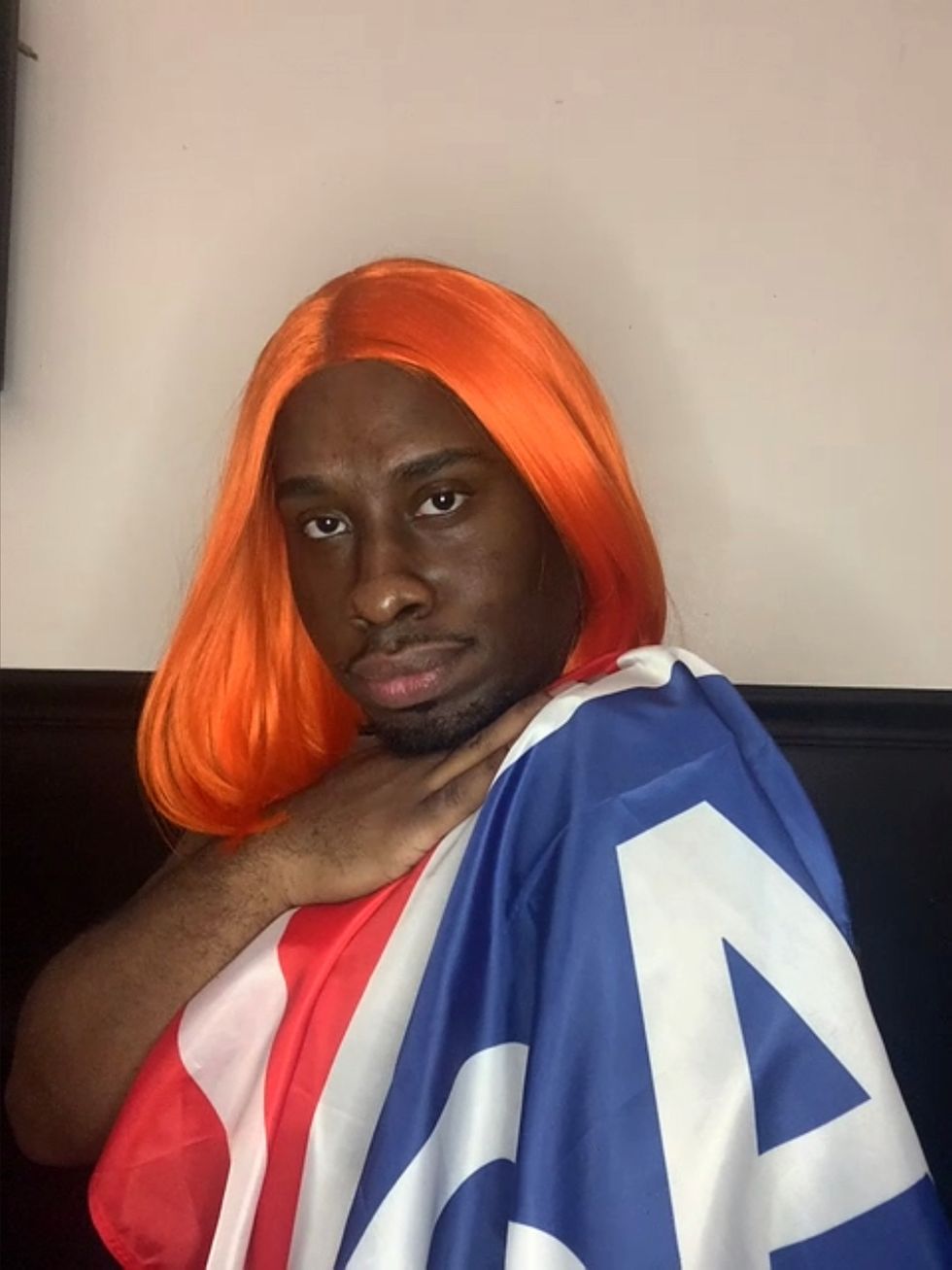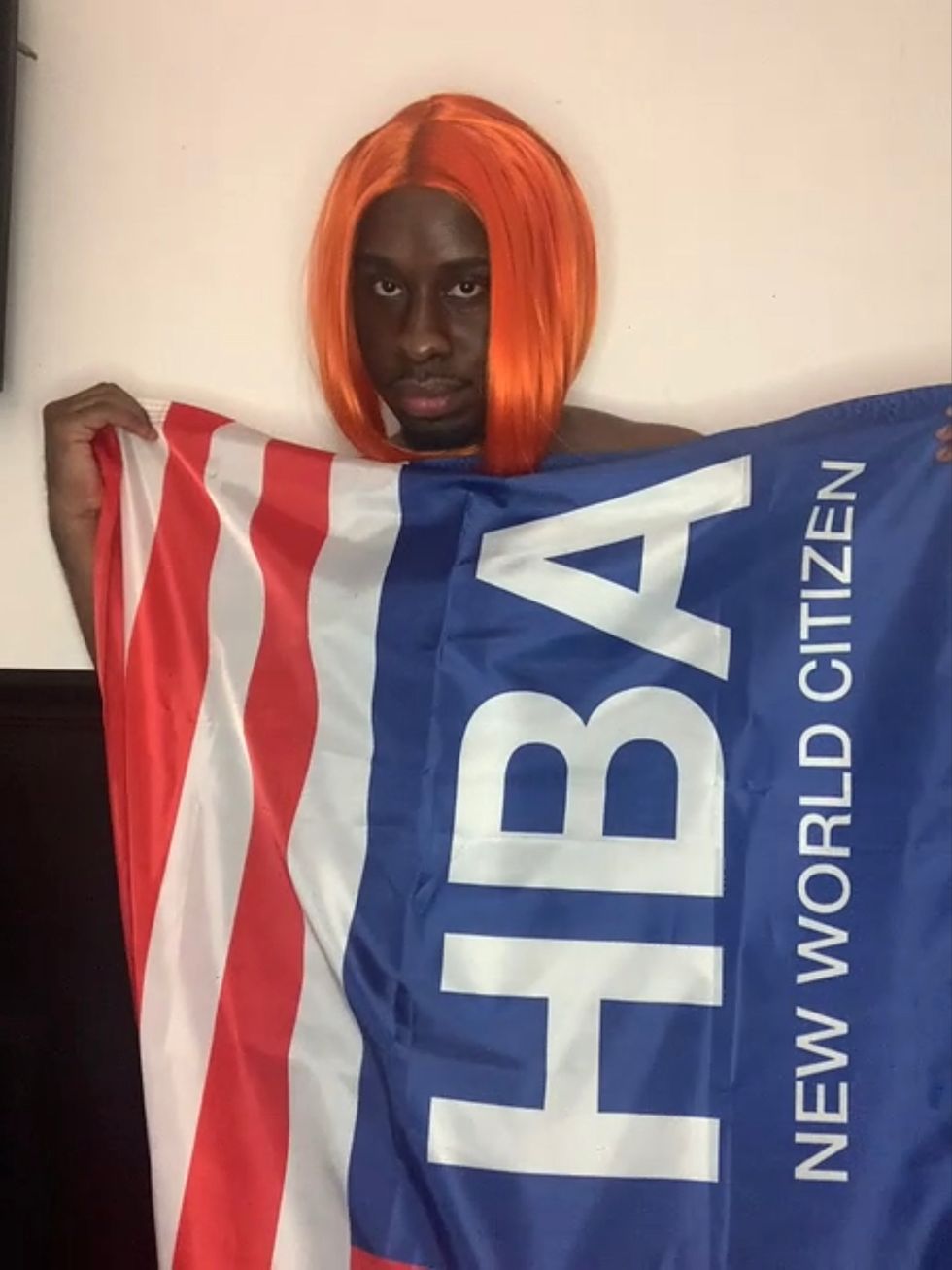 Following The Garden, Charles Gardiner — the online comedian with an impeccable wig collection — answers questions provided by HBA Creative Director Shayne Oliver and poses with the "New World Citizen" flag over Zoom for Full Tac.