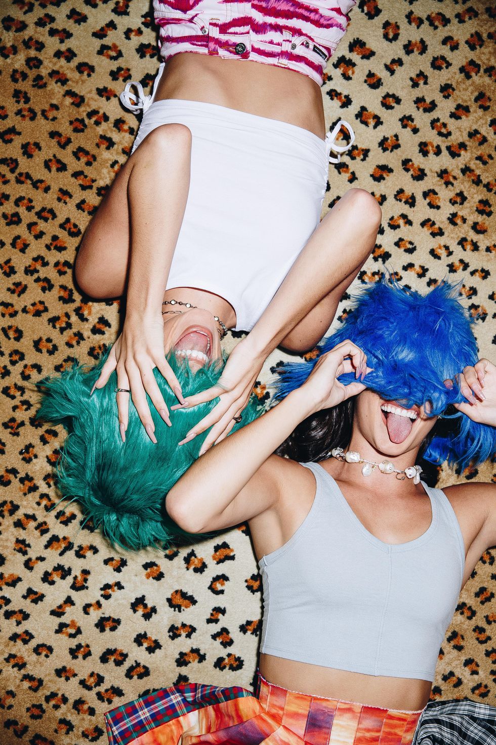 (On Charli) Hat: Stella McCartney, Top: Social Tourist, Skirt: Birthday Girl, Necklace: Weird Bits (On Dixie) Hat: Stella McCartney, Top: Social Tourist, Necklaces: Vacon and Melinda Marie, Rings: Misho and Grace Lee