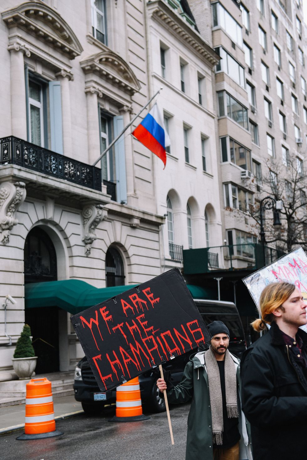As members from Voices4 set up the memorial, a man who had been filming the group from inside the Consulate came out and attempted to disassemble it. The NYPD reportedly arrived and escorted protestors away, claiming "this isn't our land," which acknowledges that the Russian Consulate building and the land surrounding it are governed by Russian, not American law.