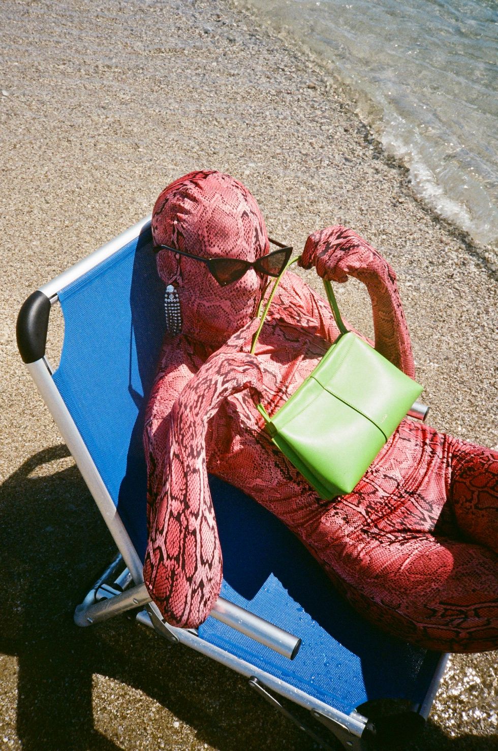 The latest brand to call upon Checking Invoices' fashion services is Wandler — the Dutch accessories and shoes label led by Elza Wandler — to show off the brand's new Carly Mini handbag. In the short film, titled "Last Days of Summer," the anonymous model heads to the beach to soak up the last bit of sun in a red, snakeskin morphsuit.