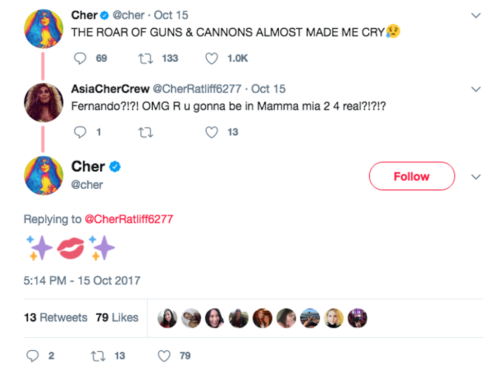The ageless goddess's Twitter fingers came in hot when it came to the reveal of her participation — which, it seems, was clearly something the film itself was trying to keep hushed. The star tweeted lyrics from the ABBA hit "Fernando," before following up with a picture of some very Mama Mia-esque boots and a cheeky kiss emoji.