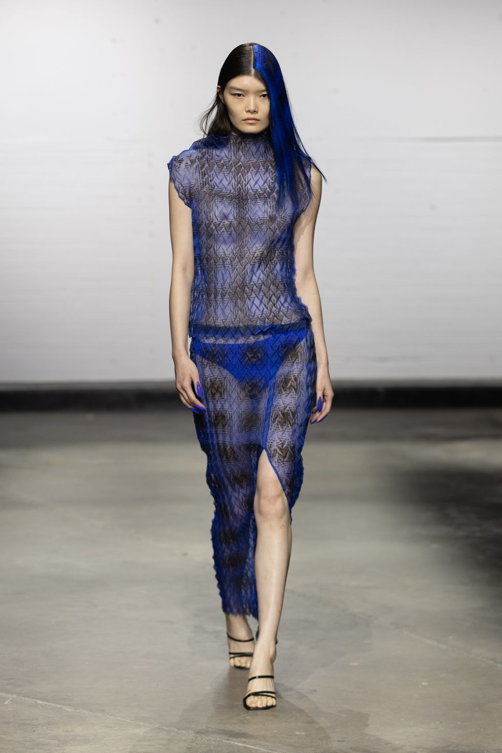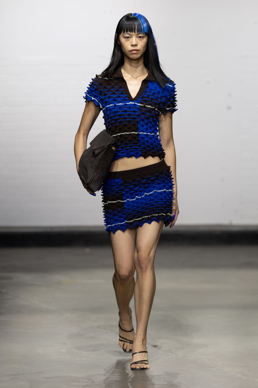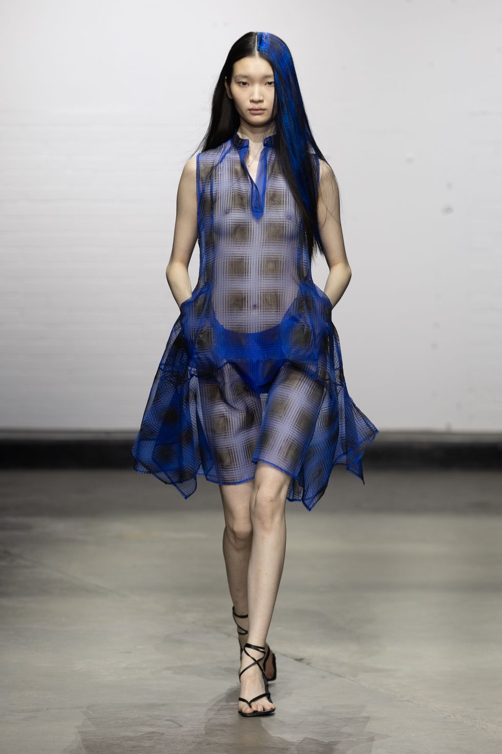 “Physically, a lot of the silhouettes I literally stole from [my mother’s] wardrobe,” Lo said, referencing the image of Cheung as an “office titan” in nine-to-five staples like tartan and checks. “We took that and juxtaposed it by putting it with a really sheer fabric or a really bizarre knit.” Many looks featured what Lo calls a “glitch print,” paying homage to Cheung’s experience in the tech world.
