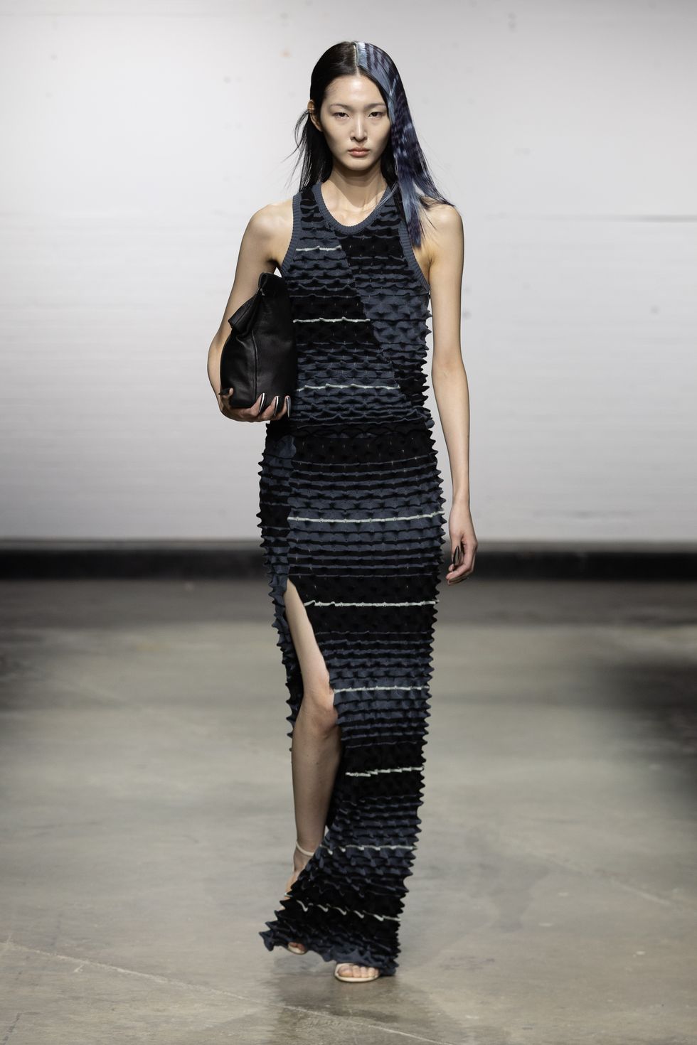 Lo’s collection traced this transformation, from Cheung’s corporate past to more recent passion projects, all while staying true to the design codes he’s now famous for. Fabrics were soft and silhouettes more classic than in previous work, presenting a noticeably mature interpretation of Lo’s signature puckered textiles that have become club kid favorites (Bimini Bon Boulash, Black Peppa and Tayce all sat front row).