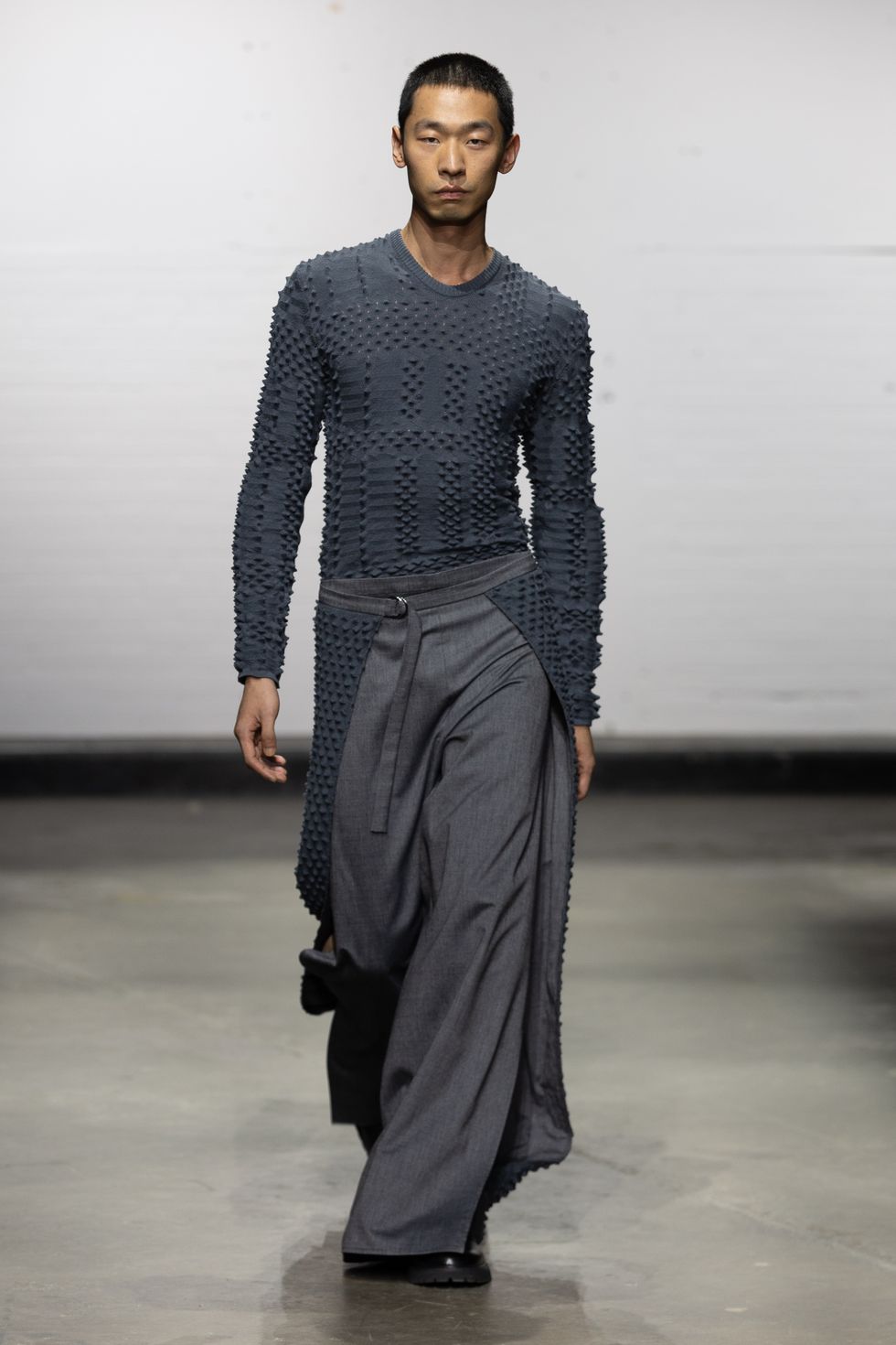 Despite centering this season on womanhood, Lo still presented a significant amount of menswear. “For the men, I wanted it to feel like classic office guys,” he said, “and then fuck it up.” This meant highlighting essentials like ties, shirts and vests, but giving those a twist like sarong trousers in suiting fabric “with a flash of leg coming through." He said, "That was really fun to create.”