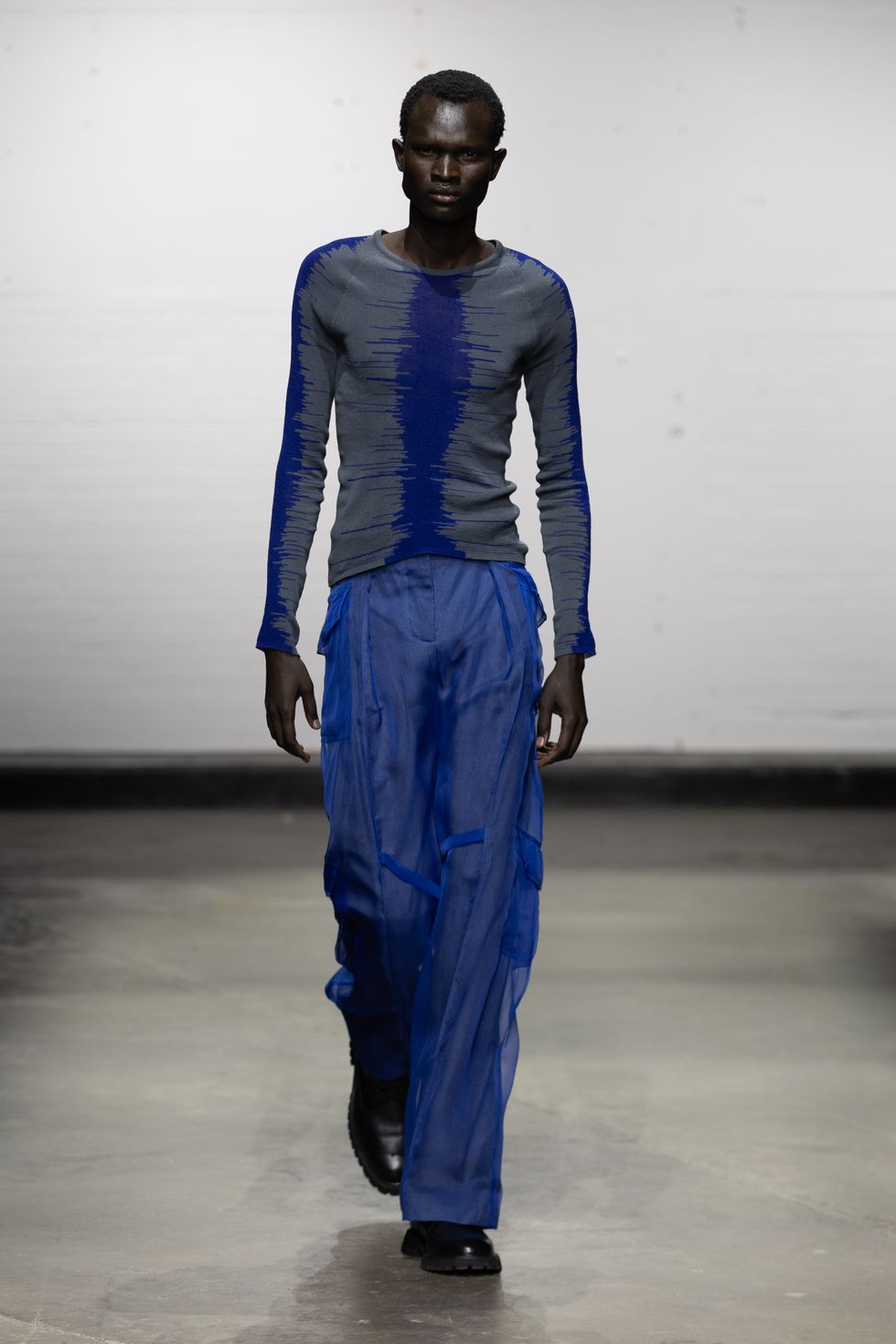 A bold royal blue dominated the collection, carried from the clothes into models’ hair and on eyebrows, although it didn’t hold any deeper significance to Lo. “That was purely accidental,” he said, his mother jumping in to express her love for the color, regardless. “I realized that brown and blue is a really nice combination, and then just went fucking nuts with it,” Lo laughed.
