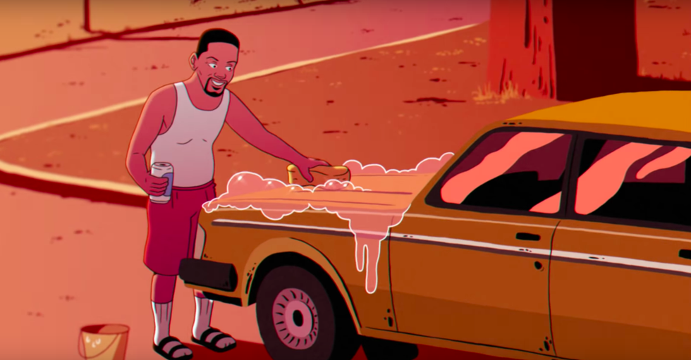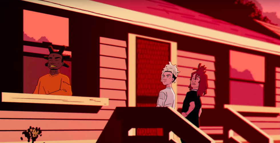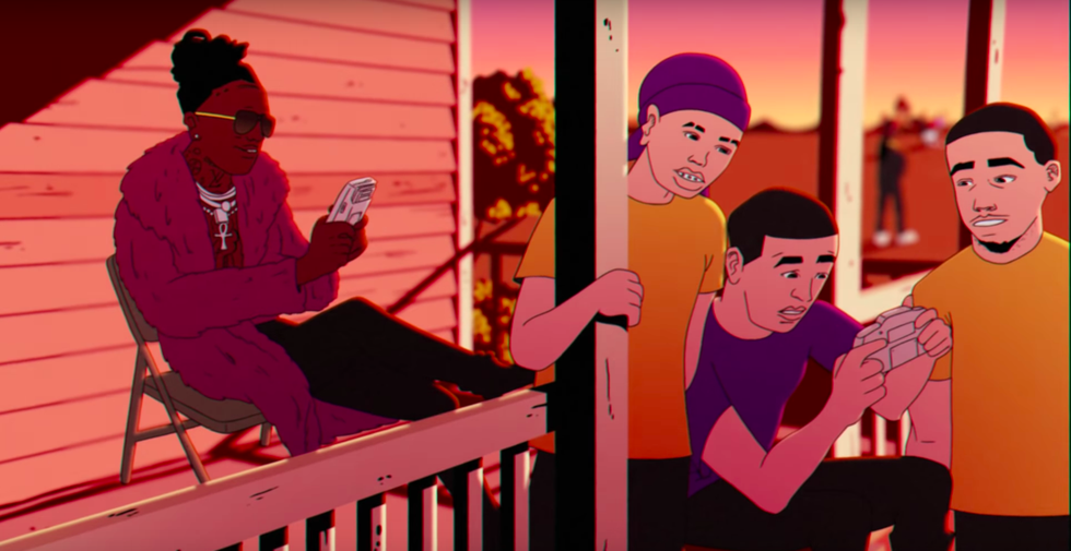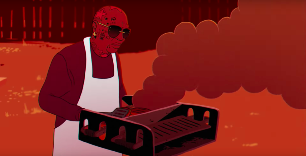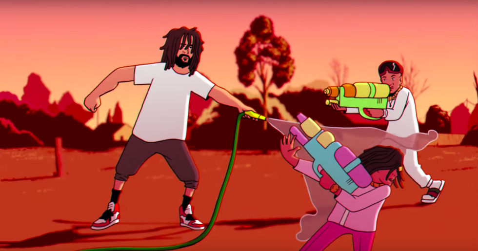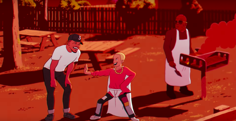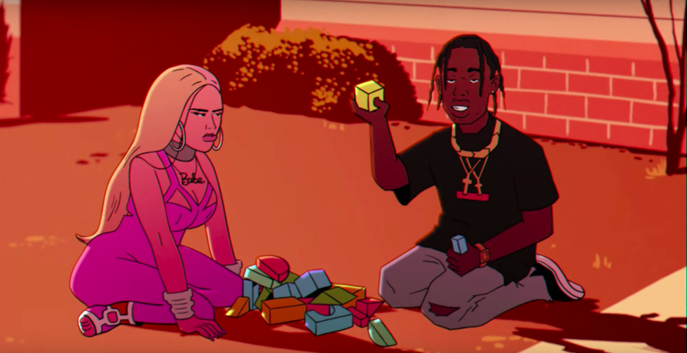It's fun to see these personalities put in a casual neighborhood setting. Migos is playing basketball by a hoop in front of the garage, Will Smith is washing a car Jaden Smith and Chance the Rapper are playing in the yard while Baby's cooking up some barbecue. And Nicki Minaj and Travis Scott — who currently have some beef due to some album and tour drama — are also captured playing together in a scene, where Travis pulls a block and ruins Nicki's castle. What a metaphor for the feud IRL!