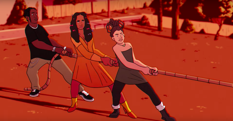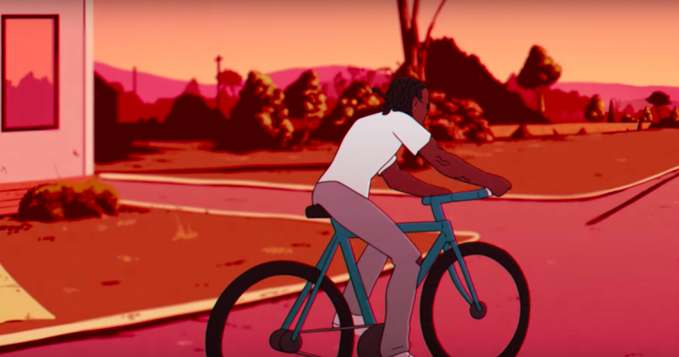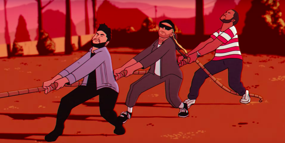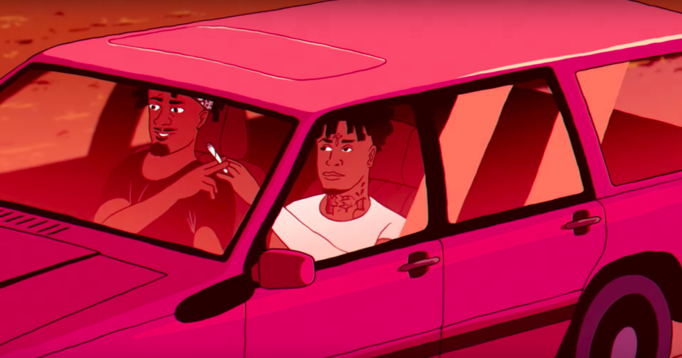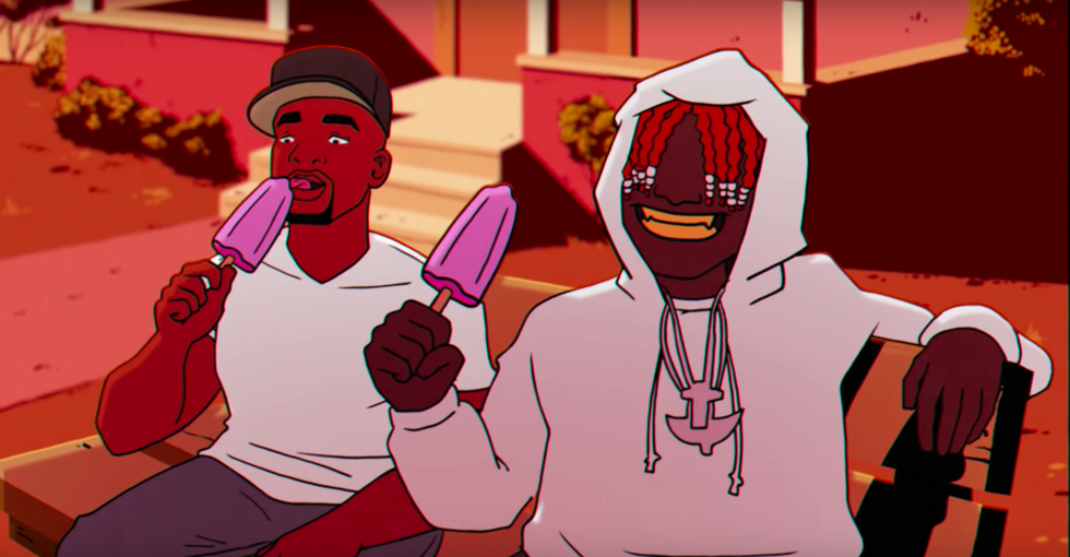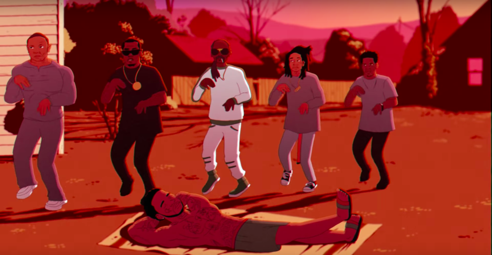 It's fun to see these personalities put in a casual neighborhood setting. Migos is playing basketball by a hoop in front of the garage, Will Smith is washing a car Jaden Smith and Chance the Rapper are playing in the yard while Baby's cooking up some barbecue. And Nicki Minaj and Travis Scott — who currently have some beef due to some album and tour drama — are also captured playing together in a scene, where Travis pulls a block and ruins Nicki's castle. What a metaphor for the feud IRL!