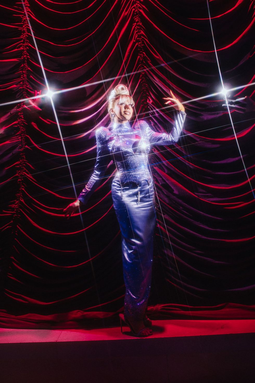I had the pleasure of wearing two separate looks for the event. First off, for my hosting gown, I was able to collaborate with my extremely talented friend, Ryan Seminara. He created something I will treasure for the rest of my life! It was the perfect lavender satin dress, taking inspiration from Mugler's Angel [perfume] bottle. Secondly, for my performance look I wore a burgundy mesh gown made entirely by me that was rhinestoned head to toe, inspired by some looks in the exhibit itself.