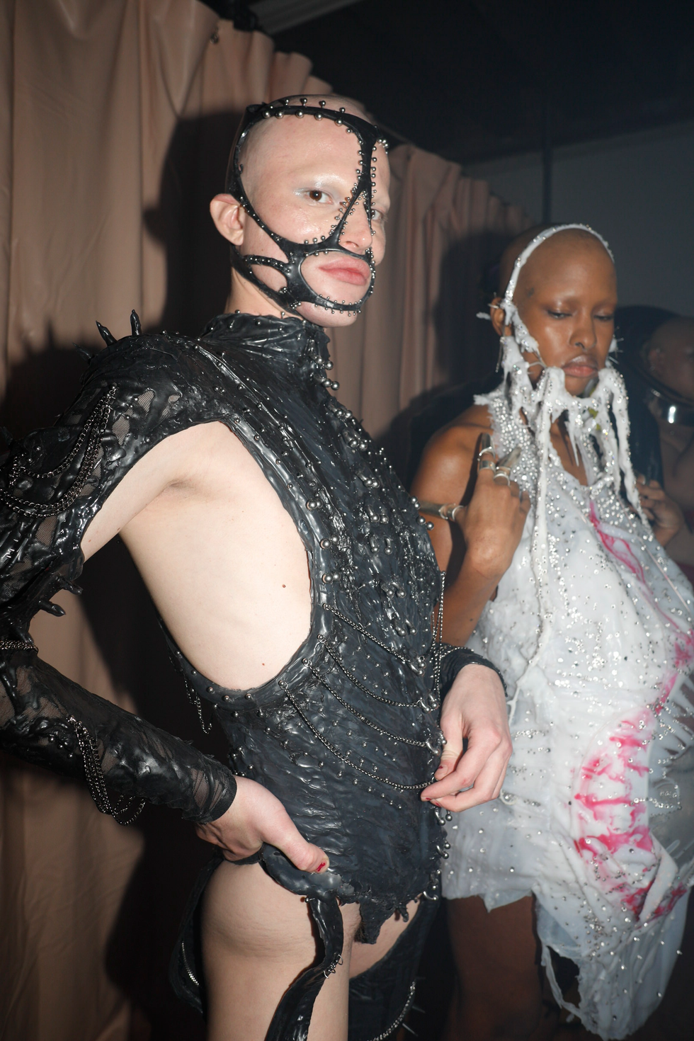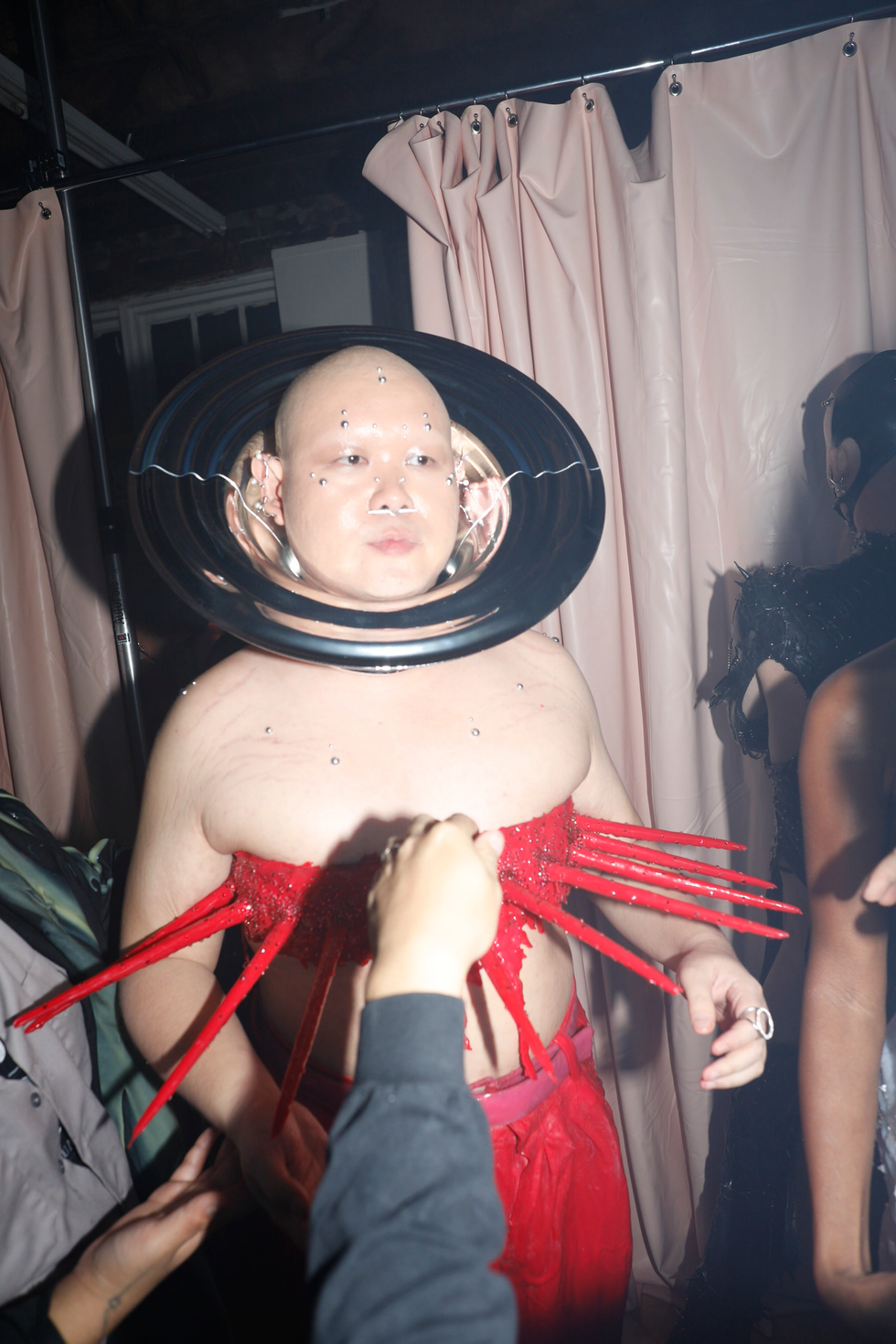 Capturing the spirit of right now, while always reimagining what’s next, Habana delivered on provocative, alien-esque fashion that isn’t restricted to one identity. All his models were bald and moved slowly in the Lower East Side installation, stroking horns on their outfits like creatures preparing weapons for a War of the Worlds. One red tube top had multiple spikes lined up horizontally, while a metal chest plate featured spikes forming a vicious “V” shape. Then, resin poured down barely there bodysuits, long overcoats and gloves with elongated fingers. iPhone accessories added a tech component to the entire experience.